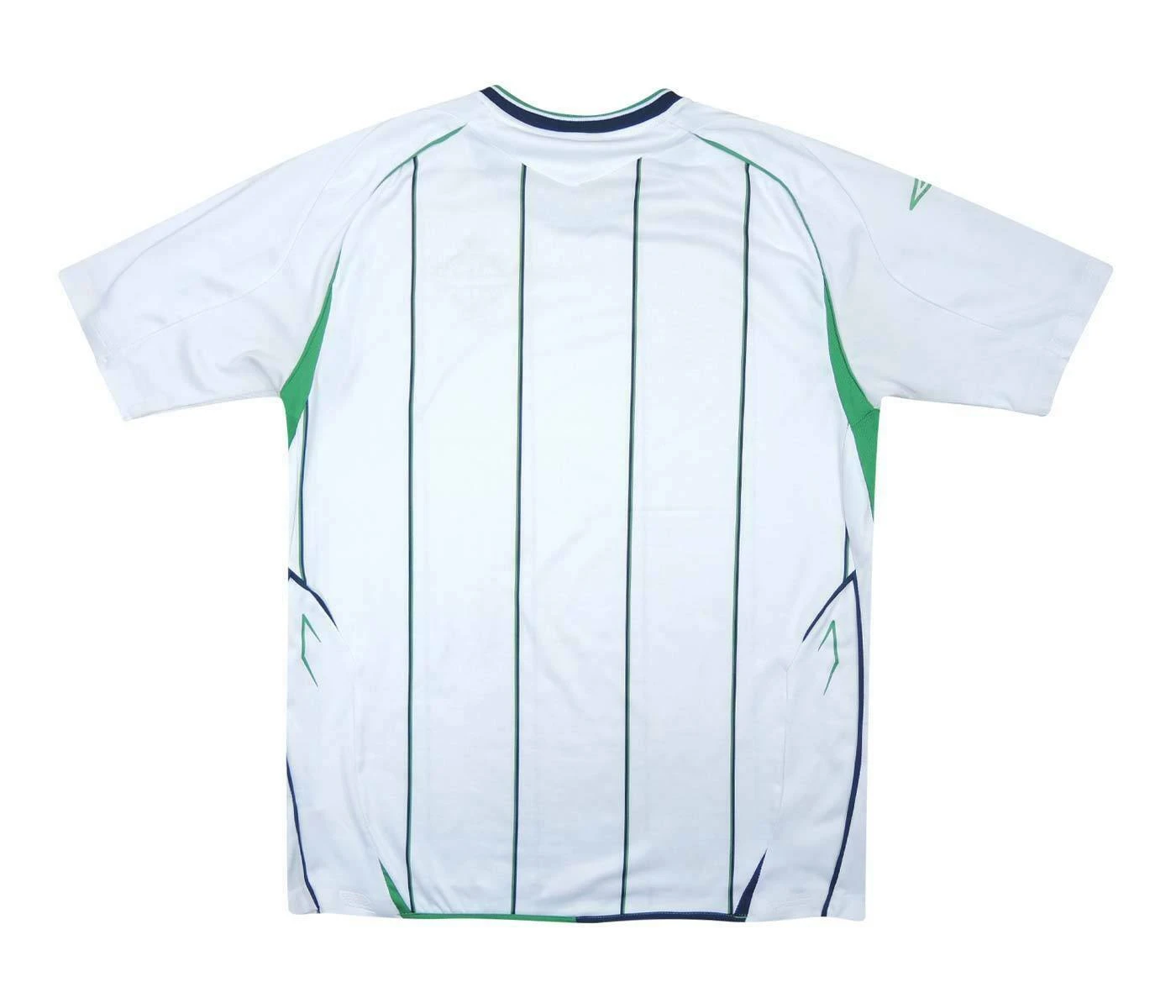 "The shirt which is classical in design is white and has green shorts and green socks, the main features of the shirt are the striped green and navy blue vertical detail which runs through the main body both front and reverse. The fabric is the latest technology that Umbro has developed - the Umbro branding running down either sleeve plays an important part to the overall retro feel to the contemporary design."