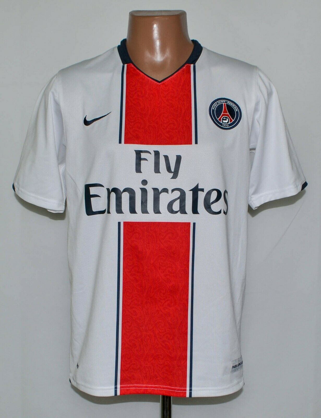 Francis Borelli, successor of Daniel Hechter, was the first to try to replace the shirt of Hechter by a white shirt decorated of two fine red and blue bands. Initially second shirt, this white unit was promoted first shirt in 1981 , the shirt of Hechter being in the same time relegated to the row of second shirt. Graphic evolution in 1990 , with stylized an Eiffel Tower replacing the two bars red and blue. This shirt remains of use two seasons and ensures the transition between the Borelli era and the Canal + era. In 1992-1993, the club adopts a white shirt with keys of blue on the shoulders.