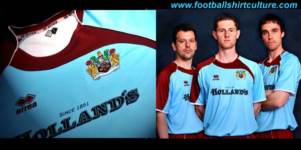 Complimenting the predominantly claret home shirt the Errea-produced away kit sponsored by Holland's Pies, sees Burnley return to a sky blue shirt with a round-neck design which features a claret flash and is accompanied by claret shorts with a blue trim.