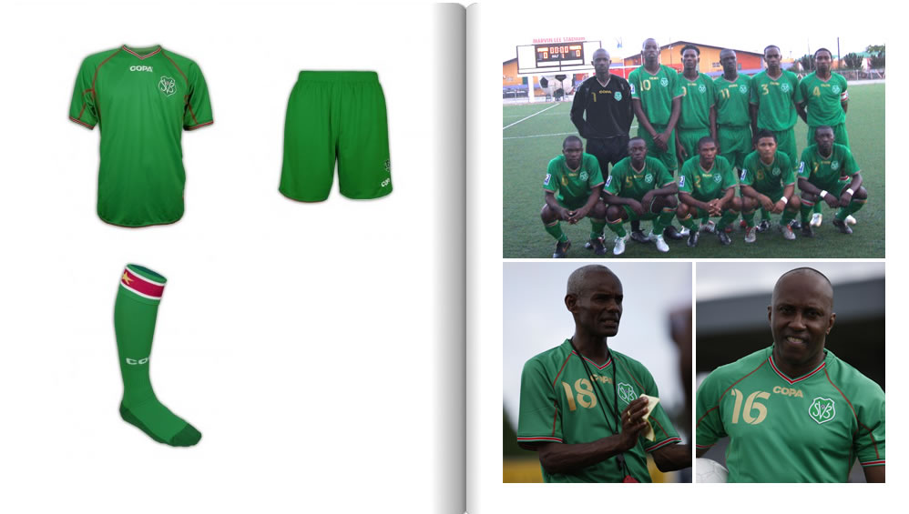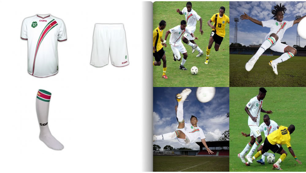 These are the Suriname World Cup 2010 qualification home, away and goalkeeper kits made by the Dutch brand COPA. The Suriname Football Association (SVB) and COPA have signed a 4 year contract in which COPA will be the official kit supplier for the Suriname national football teams.