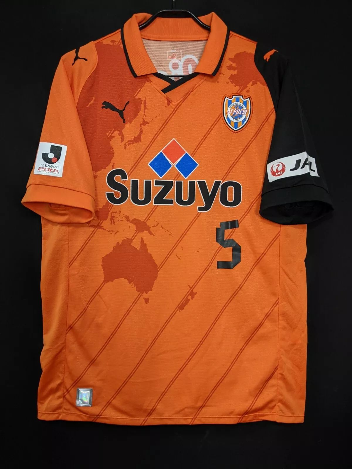 The Puma design features an orange base complemented by black sleeves, with fine diagonal stripes running across the front and back. Printed within the fabric is a detailed world map, symbolising the club’s international connections and influence. The S-Pulse crest appears on the left chest, opposite the black Puma logo, while main sponsor Suzuyo is displayed prominently across the centre.