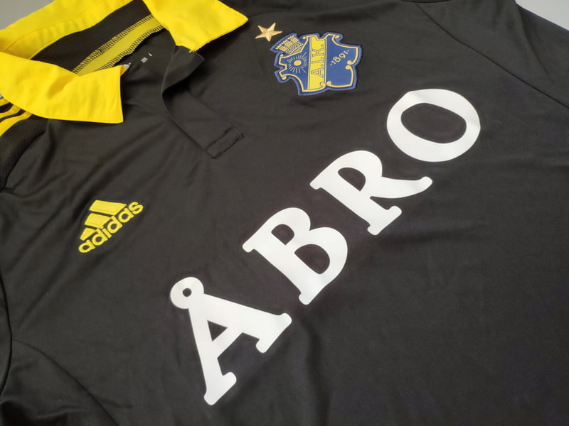 The Solna, Stockholm based side's Home shirt is in the traditional black with yellow trim - including adidas stripes - and a large yellow collar. The sponsor, Abro, appears in white, the shorts are white with yellow and black trim and the socks are hooped in yellow and black.