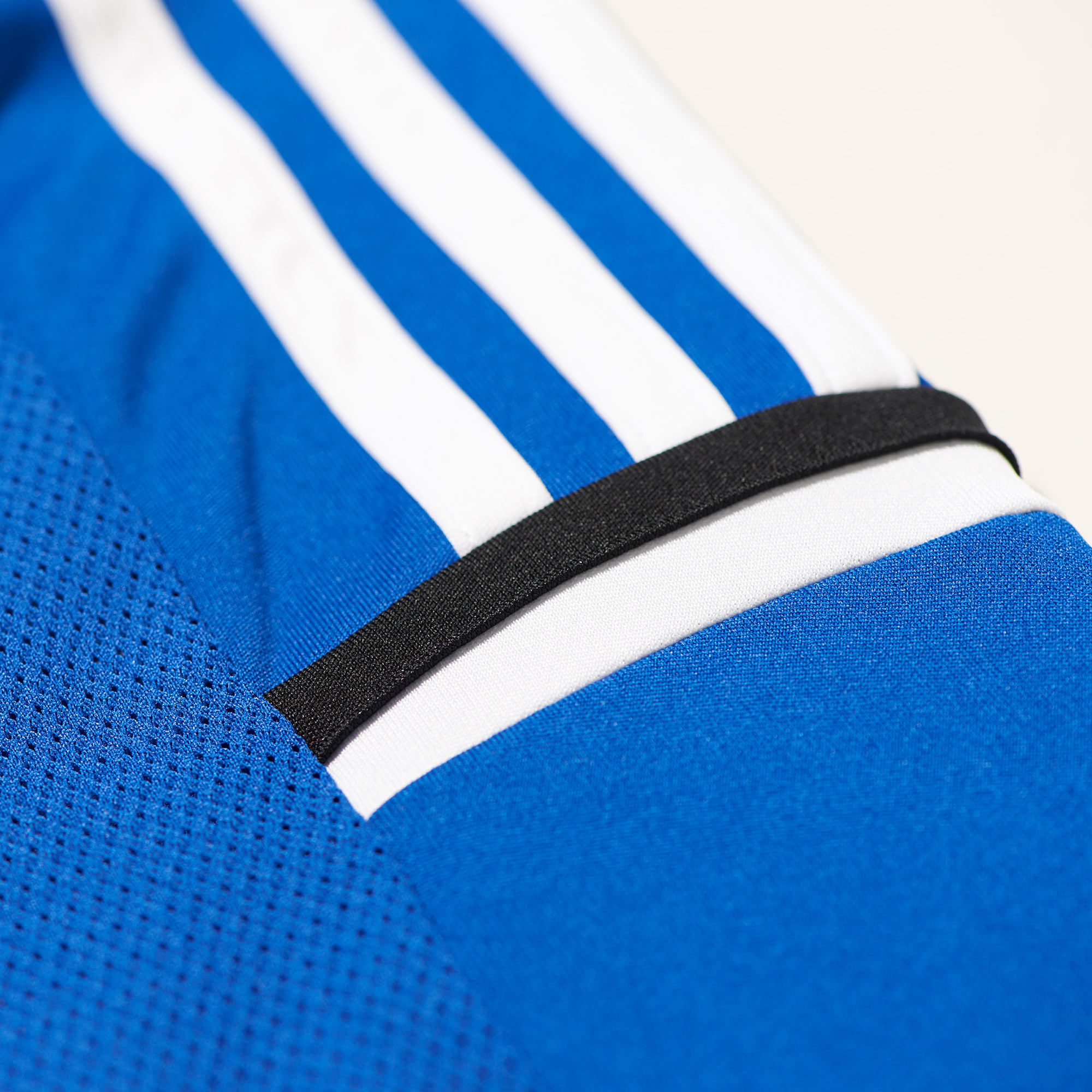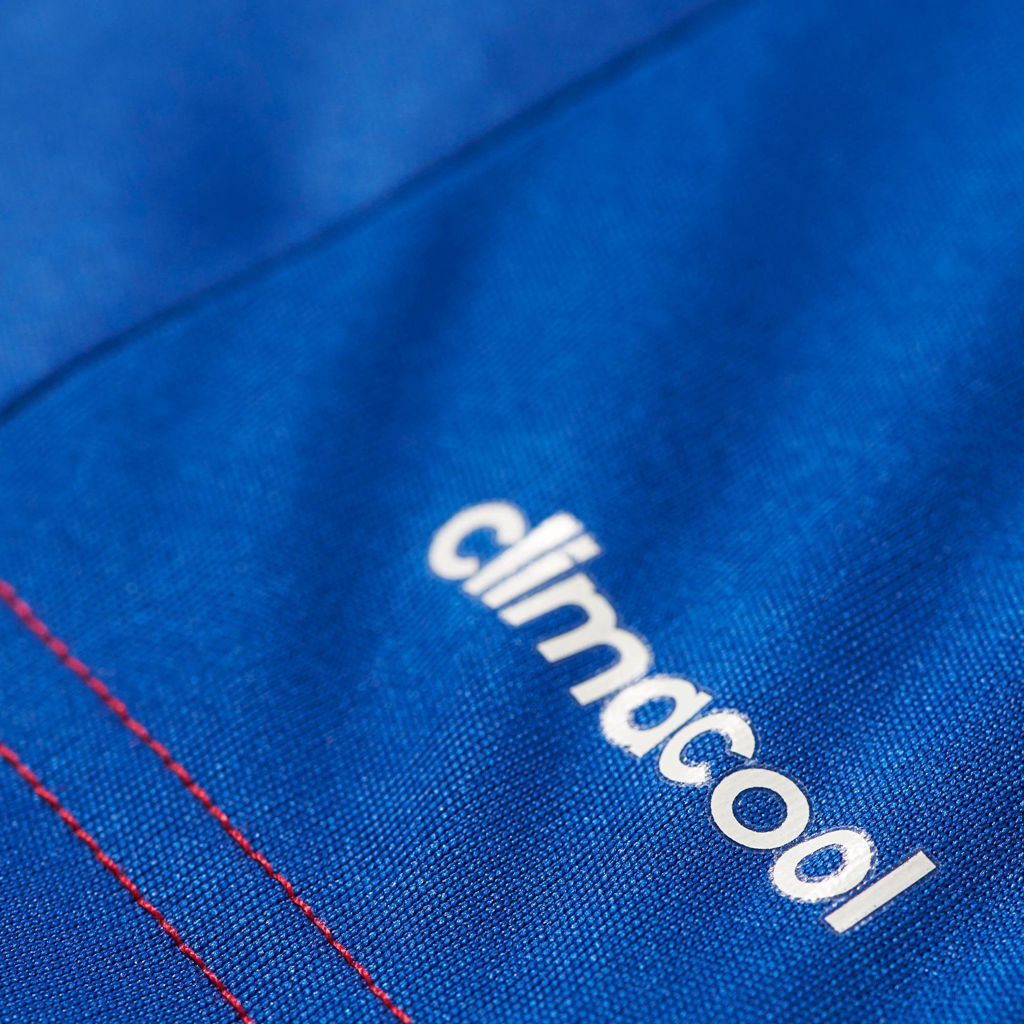 Playing with the traditional red and blue "halves", this Home version features slightly more of the latter colour, via the shoulder panels housing the white adidas stripes, and also includes black in trim on the V-neck collar, cuffs and "stopper" detail at the end of the shoulder stripes.