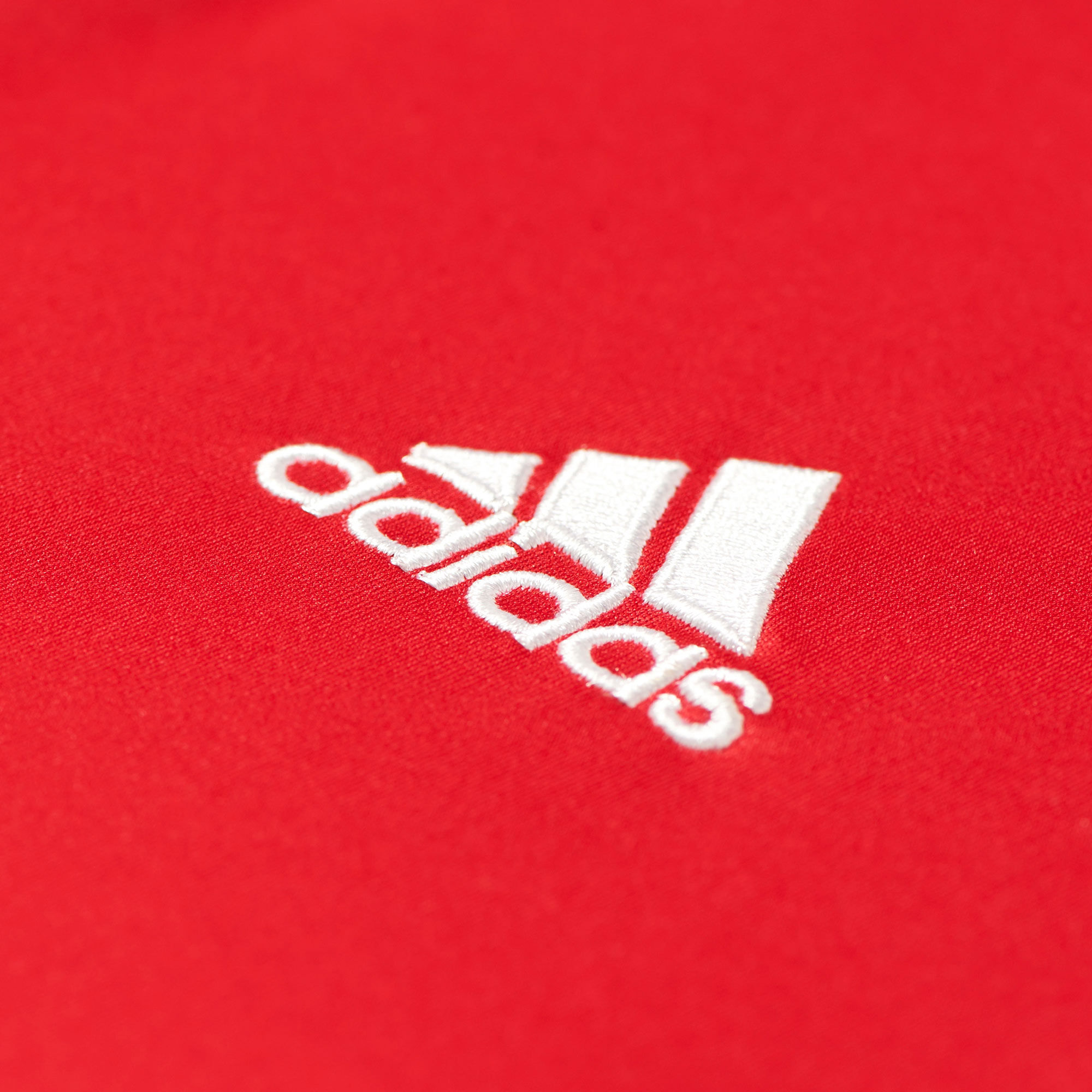 The club crest is centrally placed and the adidas logo appears on the red "half" in white.