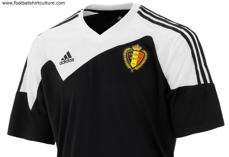 The black shirt in an established adidas template features a jagged white panel on the upper chest/shoulders, with the crest fitting into a recess and the adidas logo on said panel in black. The upper back - just below the neck - carries the Belgian national tricolour flag.