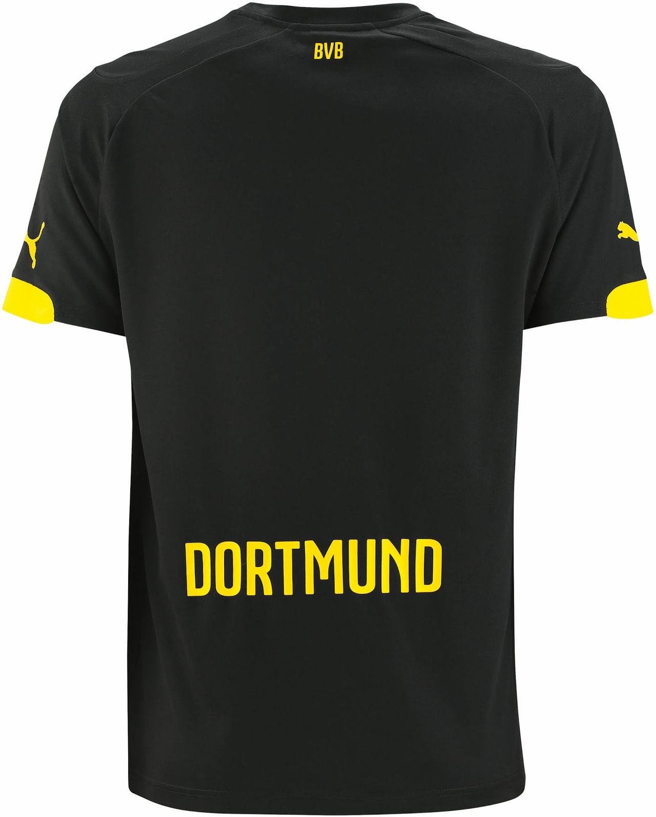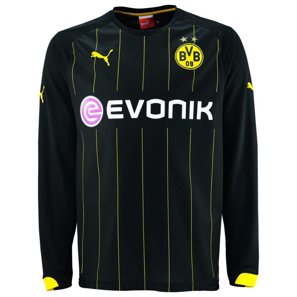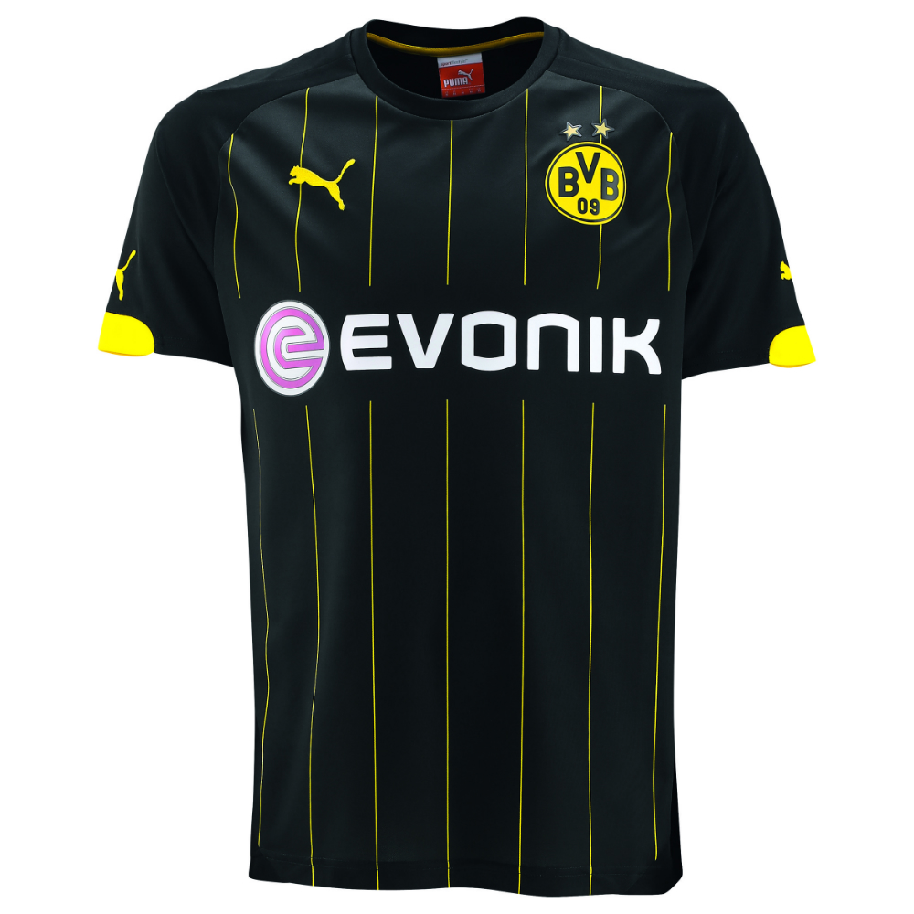The new black shirt, which will be worn in most cases when the side is required to change domestically and in their Champions League campaign, is black with yellow trim. This augmentation is in the form of neat pinstripes and cuff detail, along with the Puma logos and crest, and the logo of club sponsor Evonik appears in white and pink.