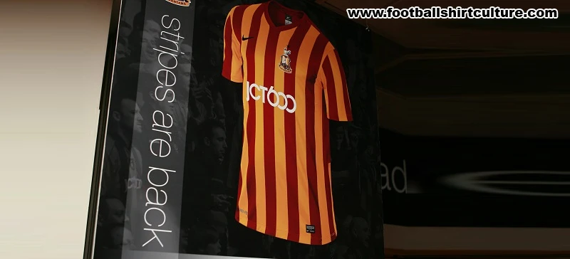 The shirt has a more traditional, retro look than previous versions, with stripes returning - in the classic claret and amber. The Nike Swoosh is in black and the sponsor's logo (JCT600) appears in white (with secondary sponsor AutoElectro on the back).