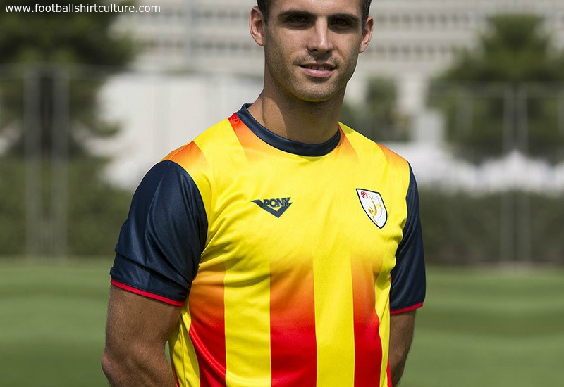 Bearing similarities to the recent Astore version of the Home shirt, the newly released model carries the famous four red - in this case - vertical stripes of the Catalan "Senyera" flag, on a yellow background, and gradually blending out to leave space for the crest and Pony logo.
