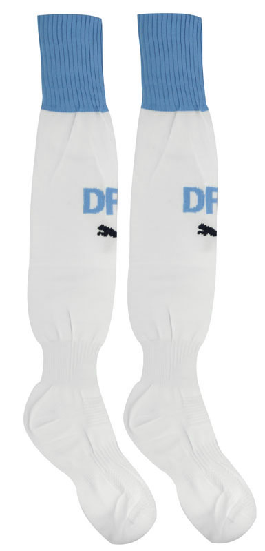 The shorts are in navy blue and the socks again white with sky blue.