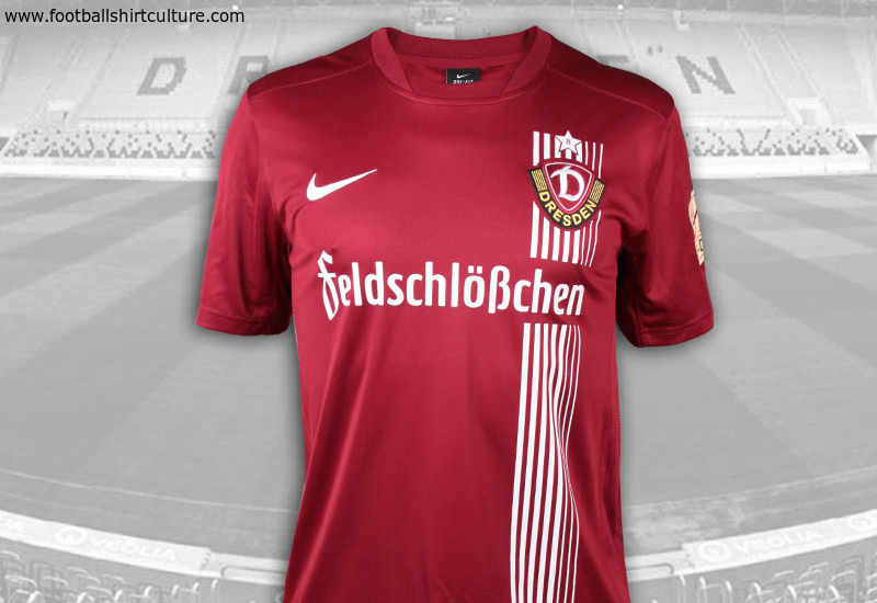 The wine red Away shirt apes the divided vertical stripe of the home kit, in white on this occasion, and also carries the city name "DRESDEN" in bold font in the standard sponsor logo position.