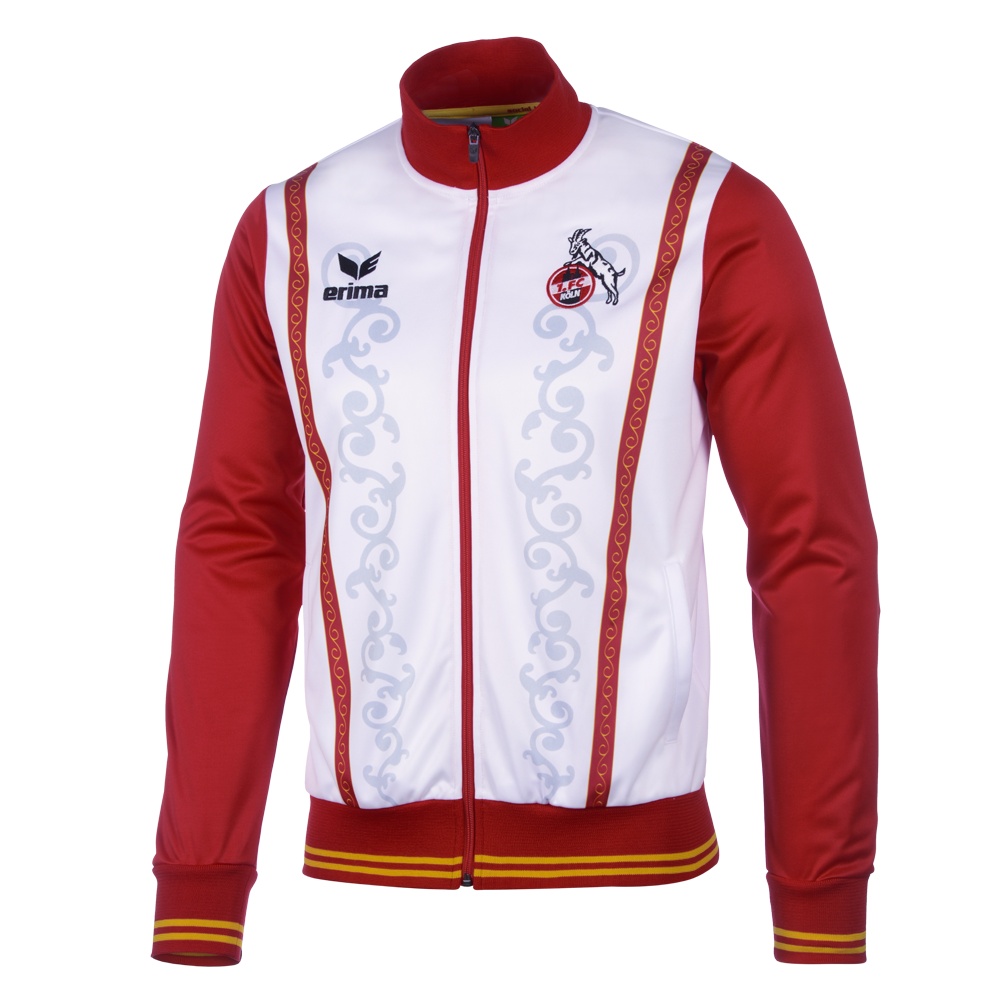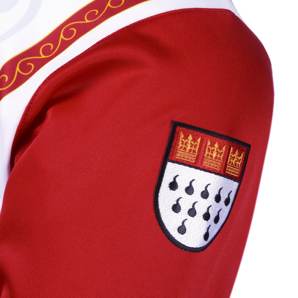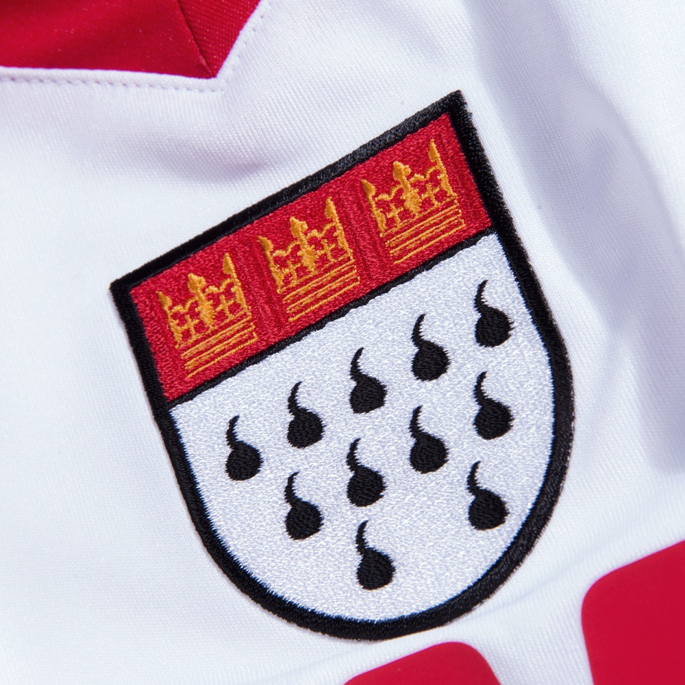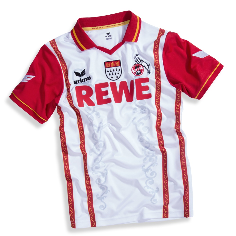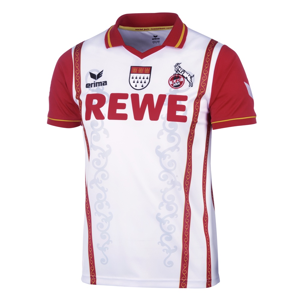 The shirt, also being retailed, is in the standard white with red, but this time the white body is complemented with vertical stripes on the sides, with gold detailing, and red sleeves. There is also a watermark of further flourishes, all as a tribute to the Carnival Prince, the leader of carnival week's main parades. The collar and cuffs also have gold trim and the Erima logo and standard crest sandwich the city coat of arms above the Rewe club sponsor logo.