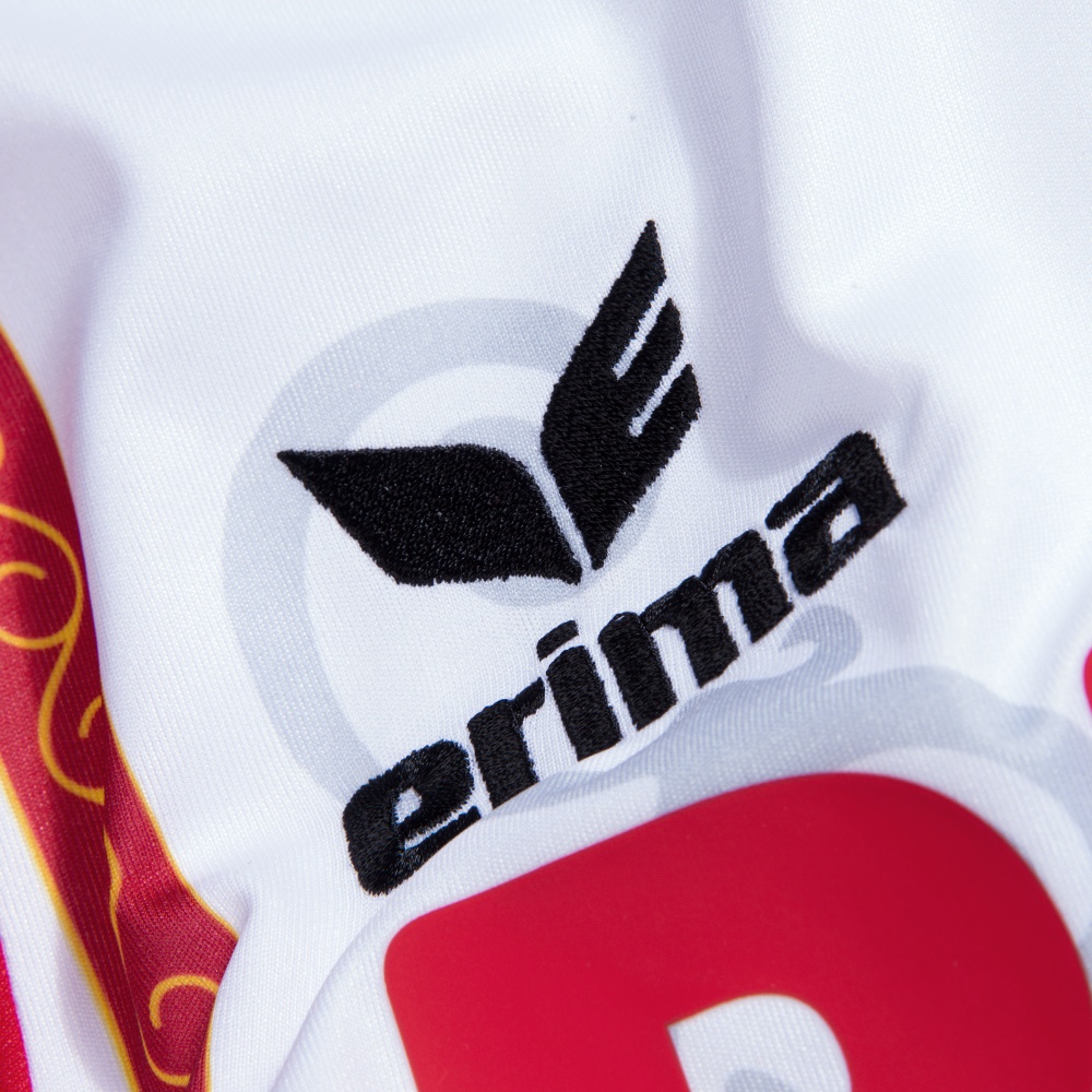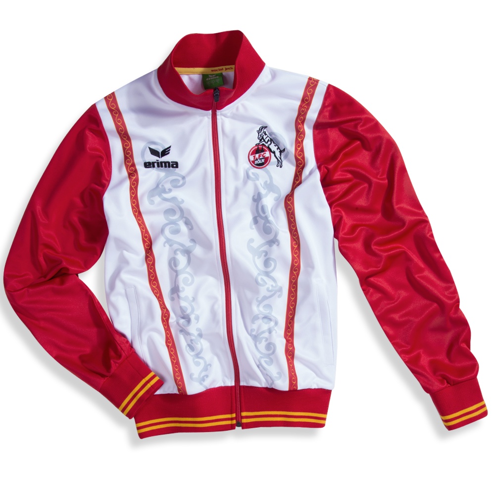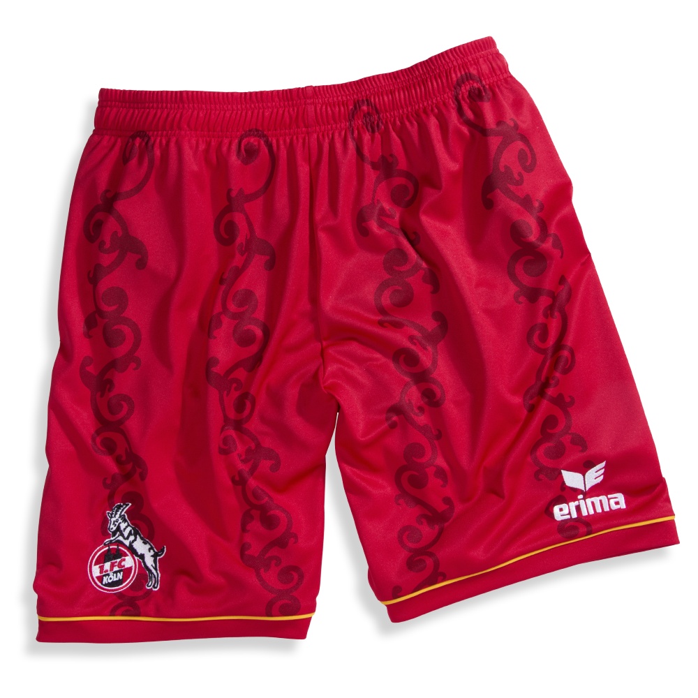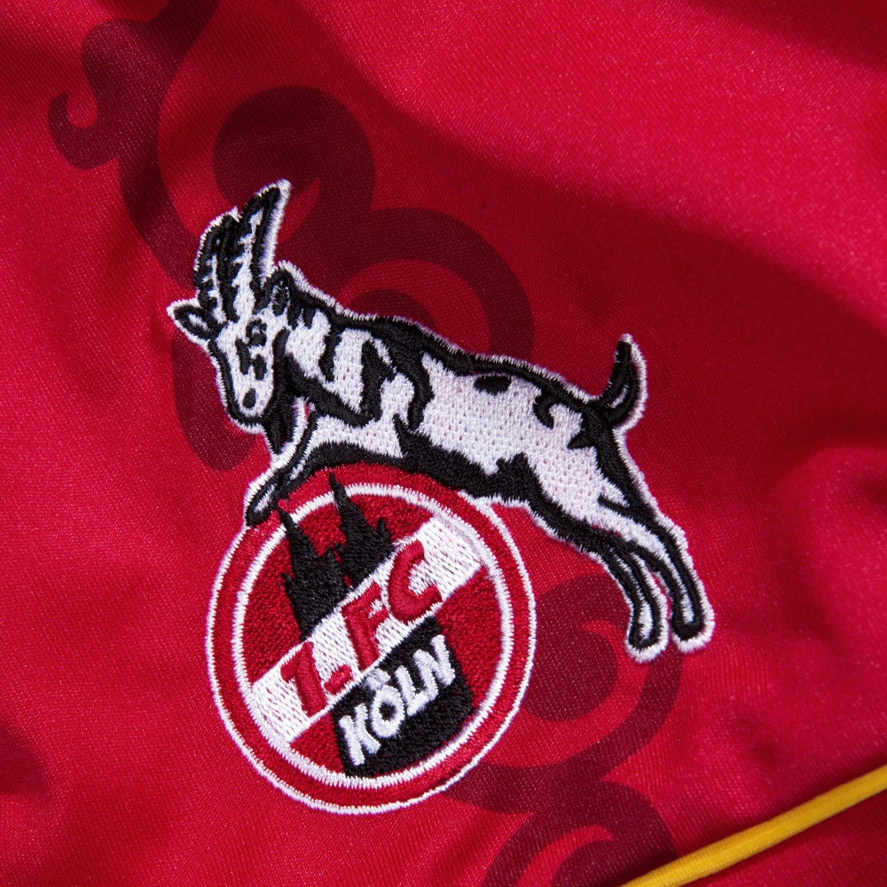 The shirt, also being retailed, is in the standard white with red, but this time the white body is complemented with vertical stripes on the sides, with gold detailing, and red sleeves. There is also a watermark of further flourishes, all as a tribute to the Carnival Prince, the leader of carnival week's main parades. The collar and cuffs also have gold trim and the Erima logo and standard crest sandwich the city coat of arms above the Rewe club sponsor logo.