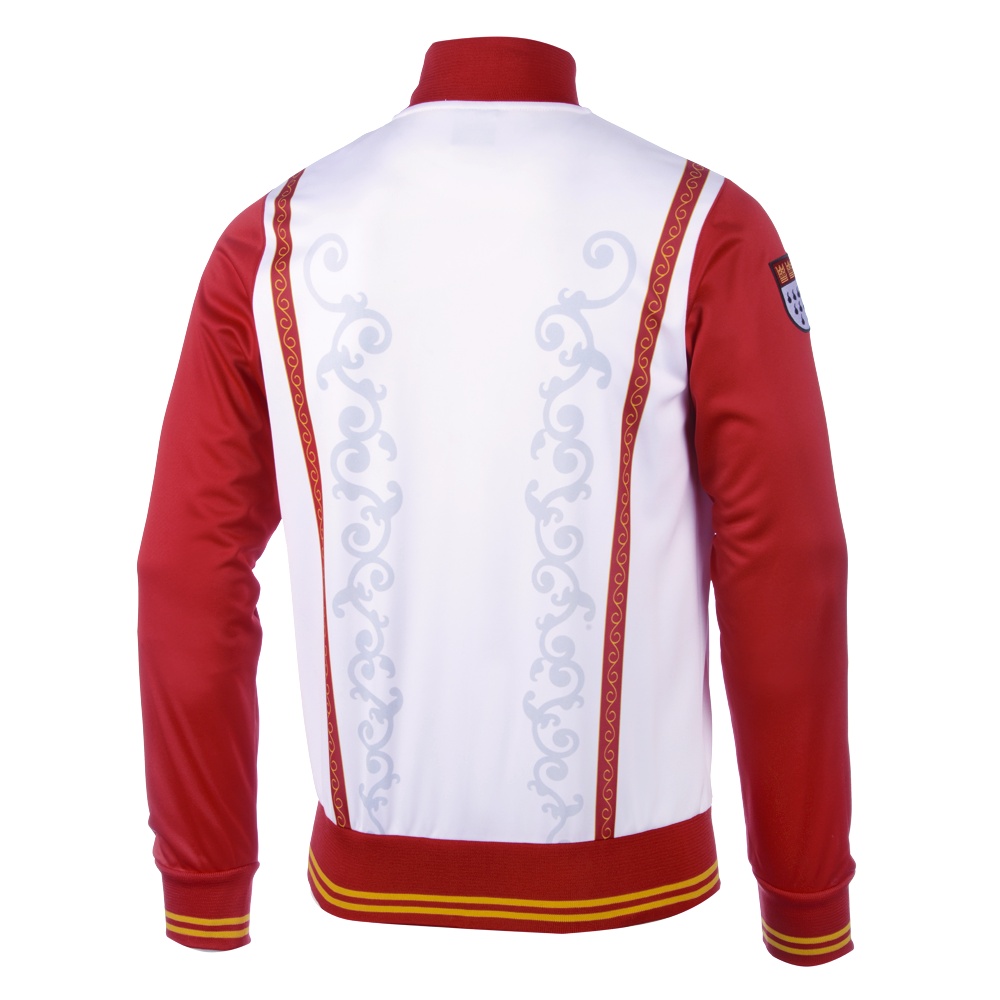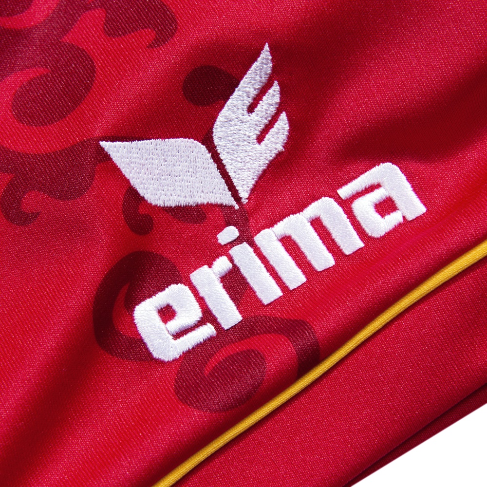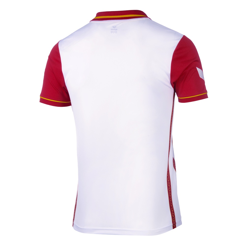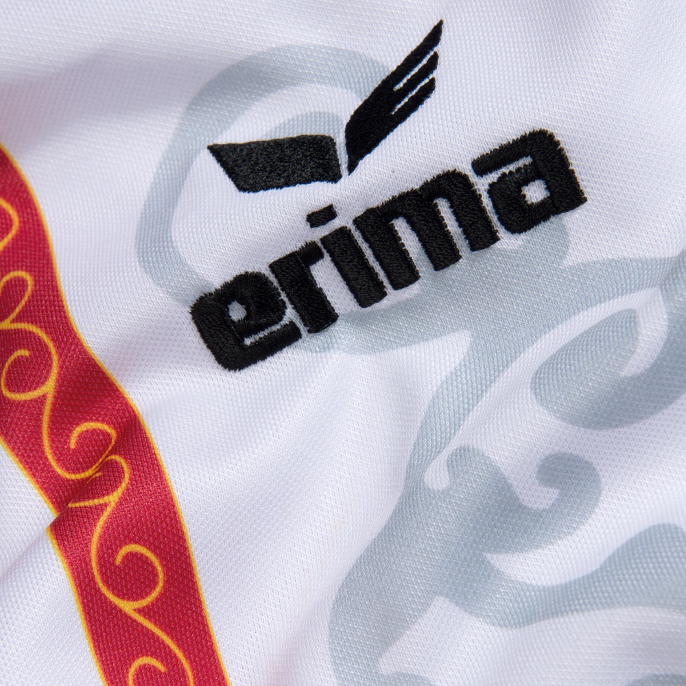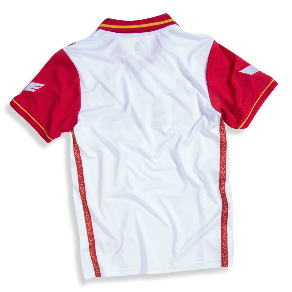 The shirt, also being retailed, is in the standard white with red, but this time the white body is complemented with vertical stripes on the sides, with gold detailing, and red sleeves. There is also a watermark of further flourishes, all as a tribute to the Carnival Prince, the leader of carnival week's main parades. The collar and cuffs also have gold trim and the Erima logo and standard crest sandwich the city coat of arms above the Rewe club sponsor logo.