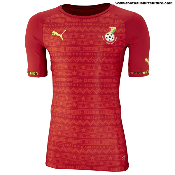 The red shirt has an intricate pattern watermark, featuring stars (representing Ghana's nickname of the Black Stars) with coloured stars on the cuffs. The Puma logos are in yellow.