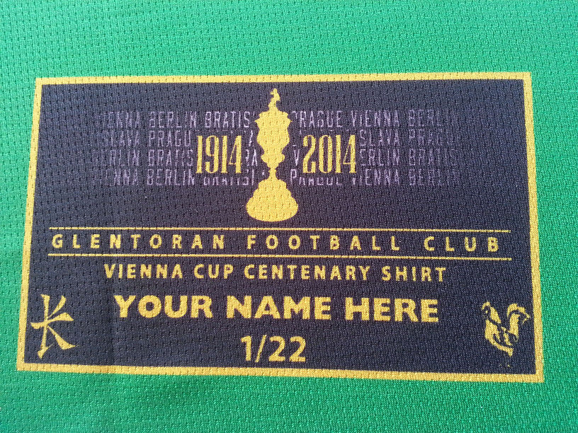 The jersey carries an embroidered Glentoran badge alongside Vienna Cup commemorative artwork. No replicas will ever be made and this shirt will only be worn once.