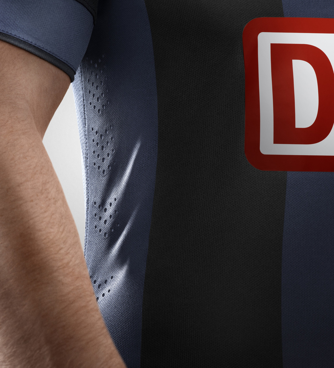 The away shirt features just five wide stripes, three in dark blue and two in black, and boasts a black contrast crewneck collar with dark blue trim, and a black sleeve with a high dark blue cuff with black trim. Inside the back of the neck is a blue-and-white pennant tab featuring a bear, which has become a symbol of the club, and also features prominently on Berlin’s official coat of arms.