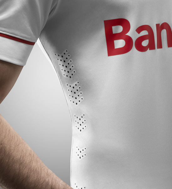 Nike's new dual-knit (polyester and cotton) fabric - on the shirt - is complemented with Dri-Fit technology and laser-cut ventilation holes, keeping the players cool and dry. The shirt, shorts and socks are produced, largely, from recycled plastic bottles.