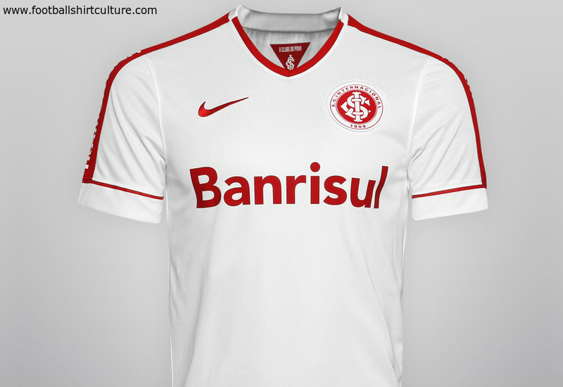 The new Away shirt is white with bold red stripes - carrying sponsors' logos - running down each sleeves before being interrupted by the thick white cuff. The collar is a V-neck with minimal red trim and the main sponsor, Banrisul, has its logo appear in red, along with the crest and Nike Swoosh logo.