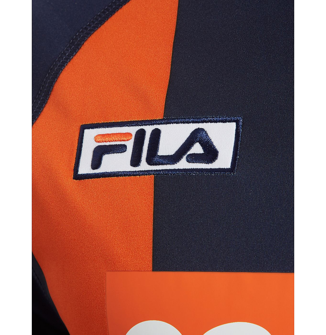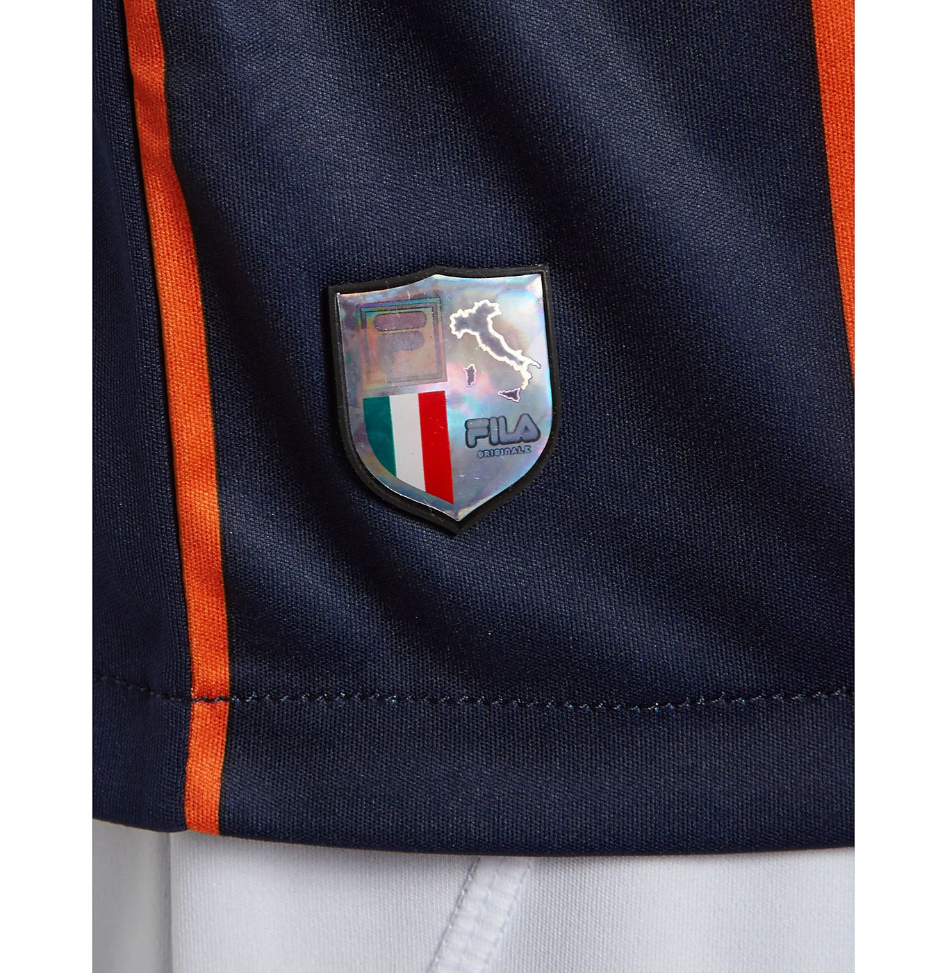 The navy blue and orange striped shirt carries the now (in)famous Fila logos on each shoulder and the equally notorious easyJet sponsor logo across the chest. The sleeves and back of are plain navy.