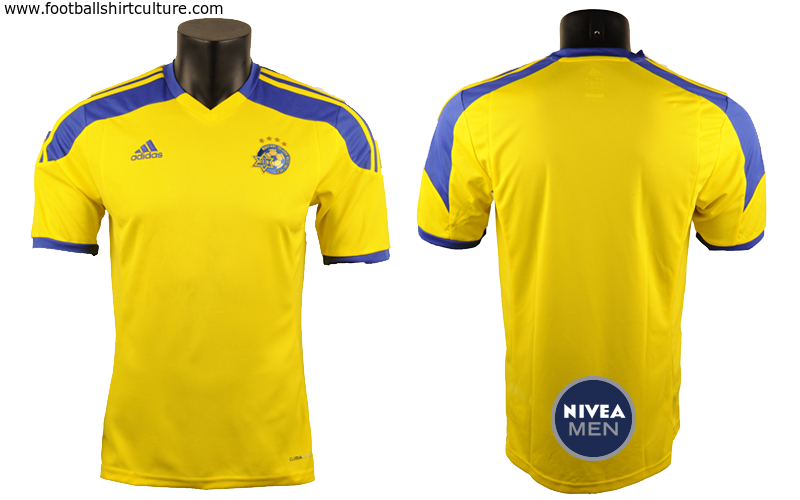 The Israeli side's new shirt is in the standard yellow, complemented with the usual blue which appears in sections on the shoulders, which in turn contain the adidas stripes, in yellow. There is a simple V-neck collar and club sponsor Nivea has its logo on the lower back.