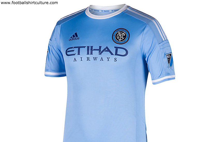 In predictable Manchester City (stablemate) colours of sky blue (actually branded as "City Blue") and white with darker blue details, the neat roundneck collar and cuffs are in white, along with the adidas stripes. The adidas logo, much of the NYC subway token-styled crest and the Etihad Airways sponsor are in the darker blue.