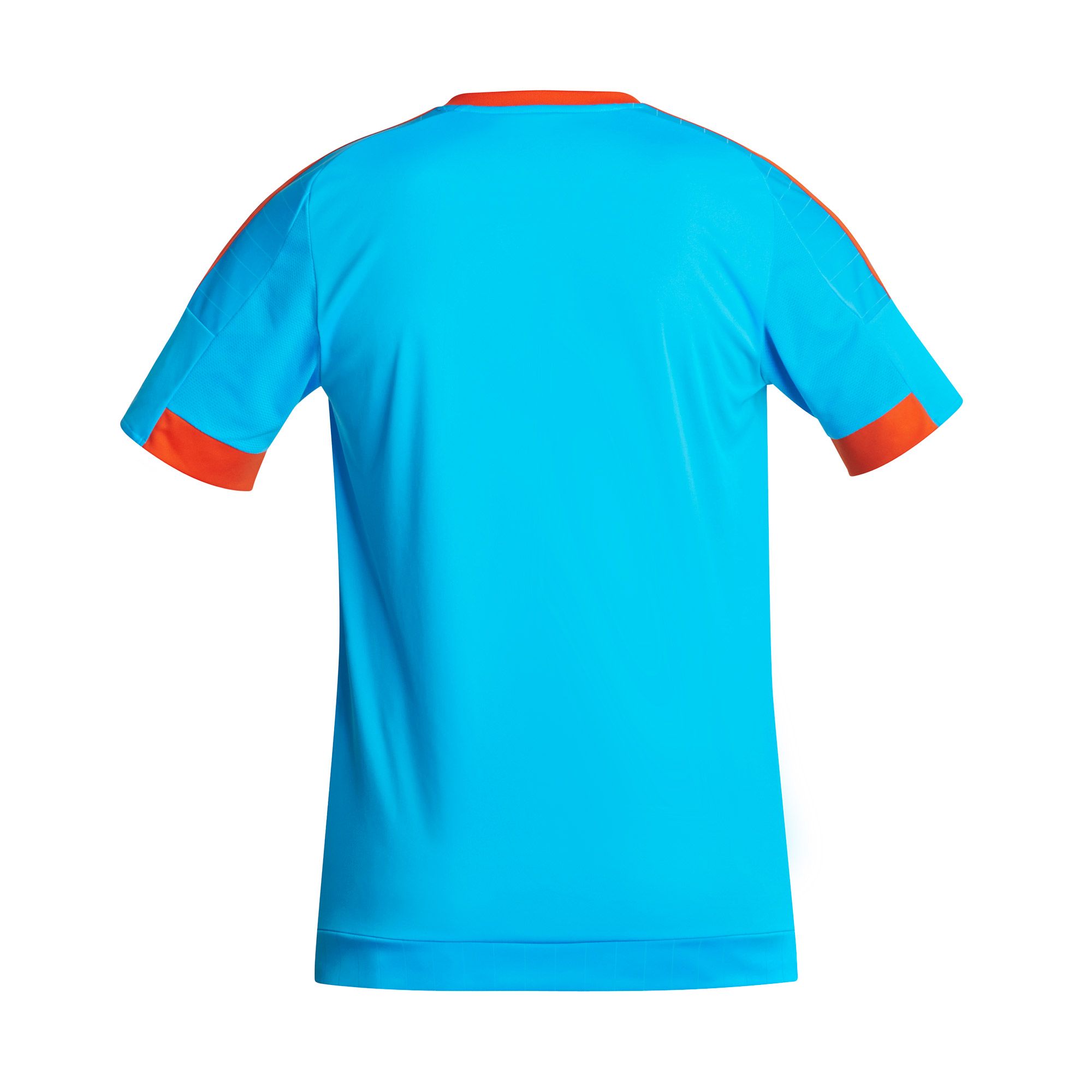 Orange - with its identifiable anti-fascist connotations and links to a particular supporter group at l'OM - is regularly used on change strips and, recently, on a Home kit. On this occasion it appears by way of the V-neck collar, a partial cuff, the adidas stripes, the adidas logo, the standard commercial crest (in outlined form) and the sponsor's logo.