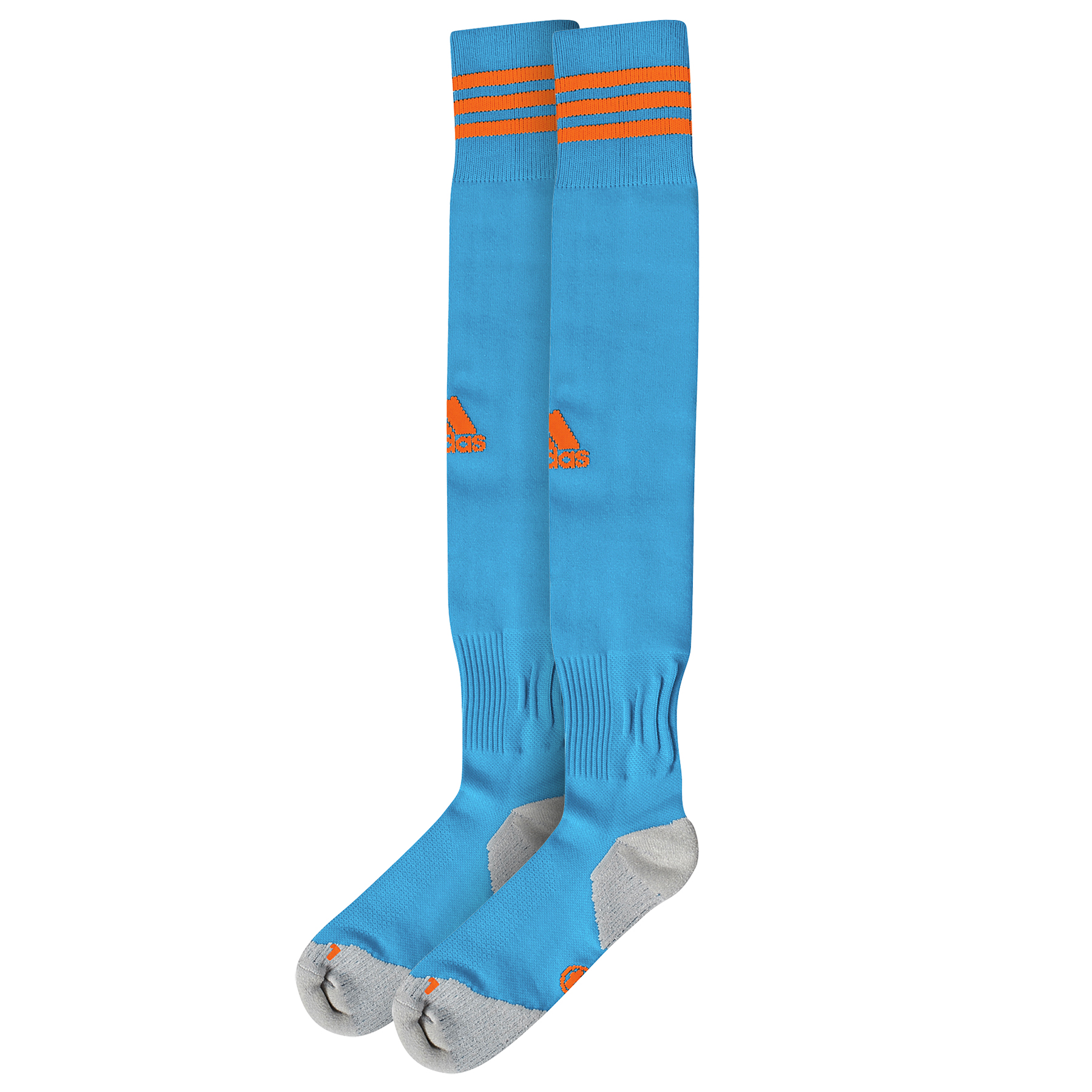 The shirt - featuriing ClimaCool technology for breathability and keeping players cool and dry - is complemented with matching shorts, boasting a thick orange contrast hem border, and socks in blue with orange adidas stripes on the turnover.