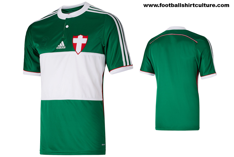 The new shirt is in green, with a central white band across the front. I has a white grandad collar, white adidas strips and just minimal use of red trim.