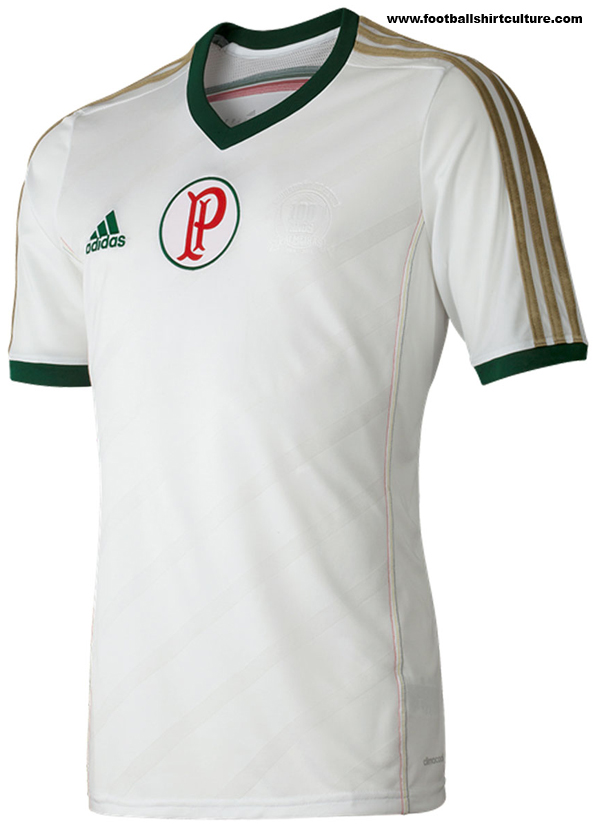 The white shirt with green V-neck collar and cuffs, gold stripes and a diagonal line pattern watermark also includes a retro red "Palestra Italia" crest (referencing the hugely successful original form of the Brazilian club) to continue the recent theme of centenary celebrations.