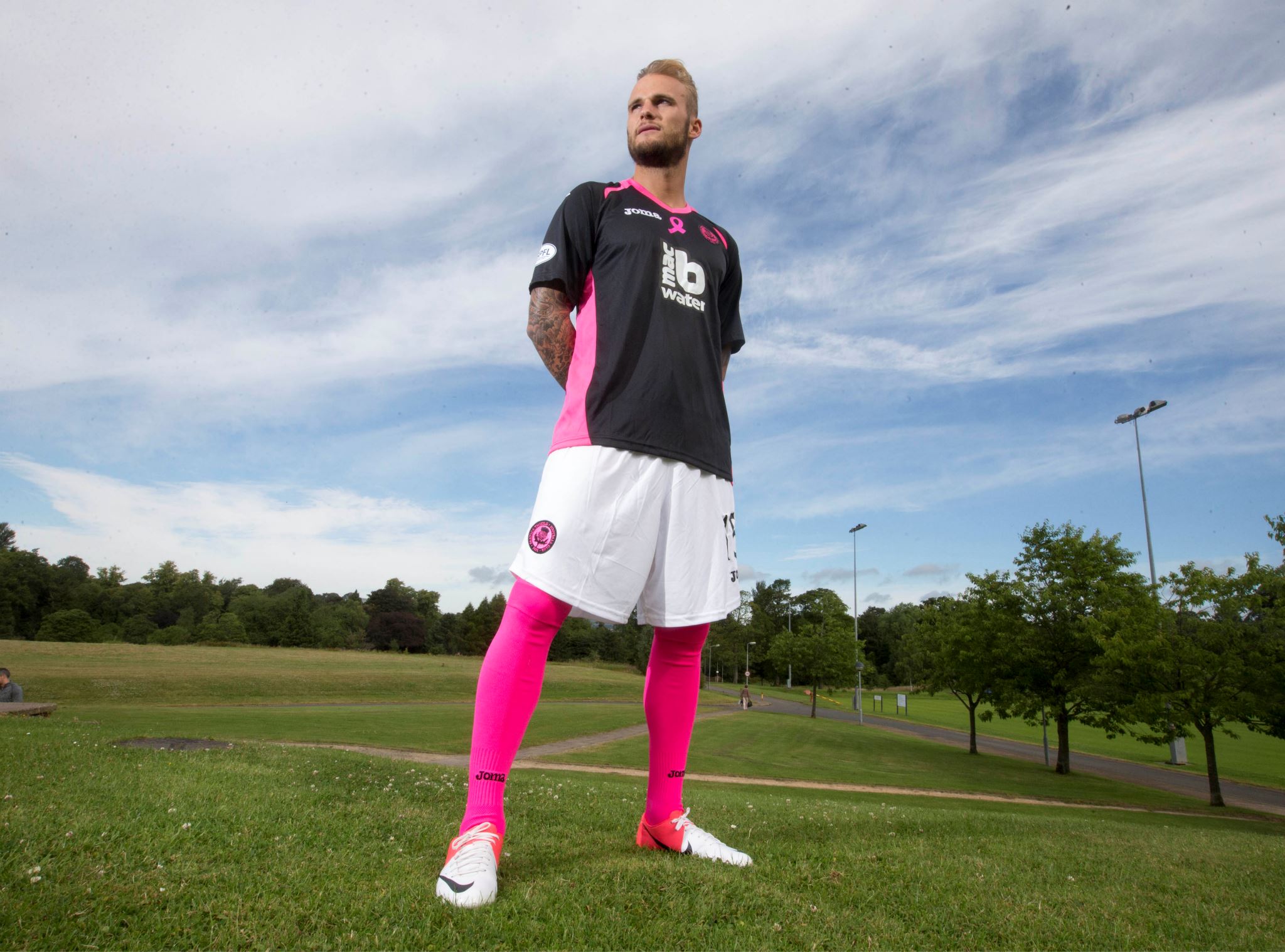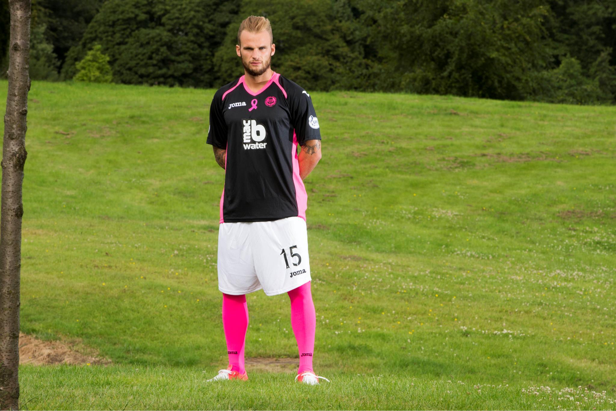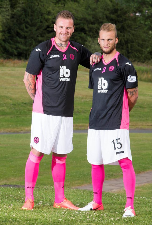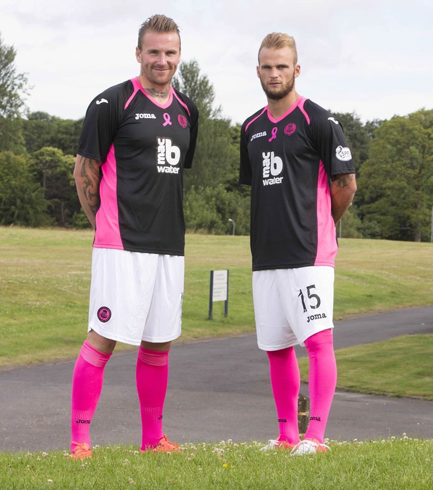 The shirt is designed to draw attention to the charity Breast Cancer Care Scotland - with each shirt sold seeing £3 donated to the cause - in black with pink panels on each side, the famous pink ribbon in the middle of the chest and further pink trim on the shoulders and by way of the neat V-neck collar. The sponsor, macb Water, has its logo in white.