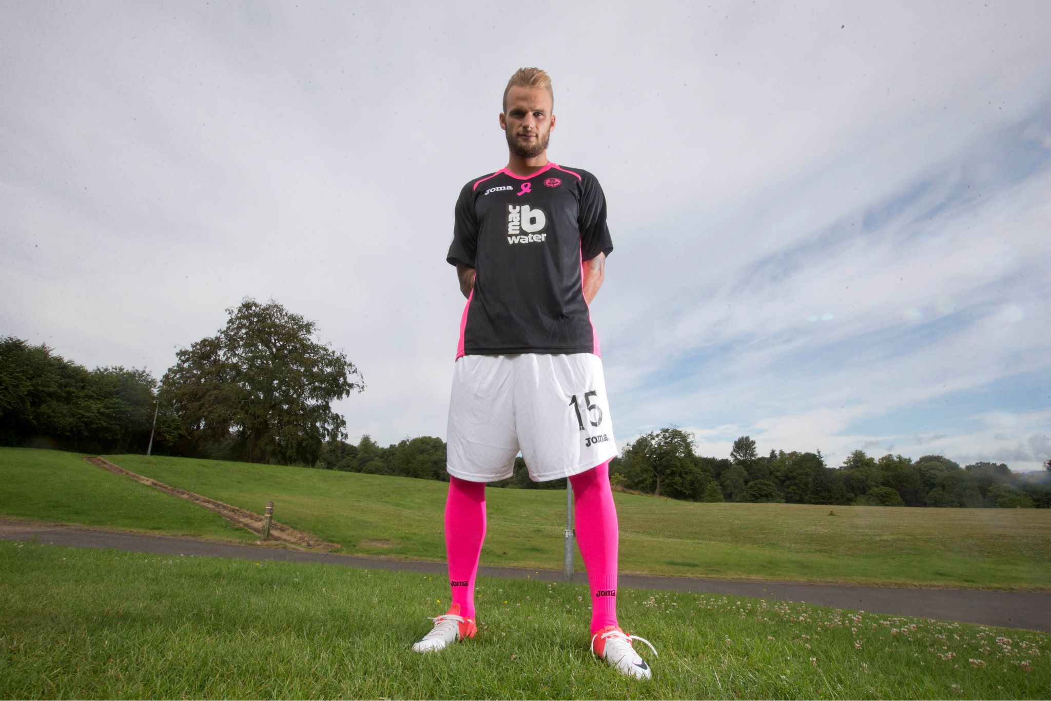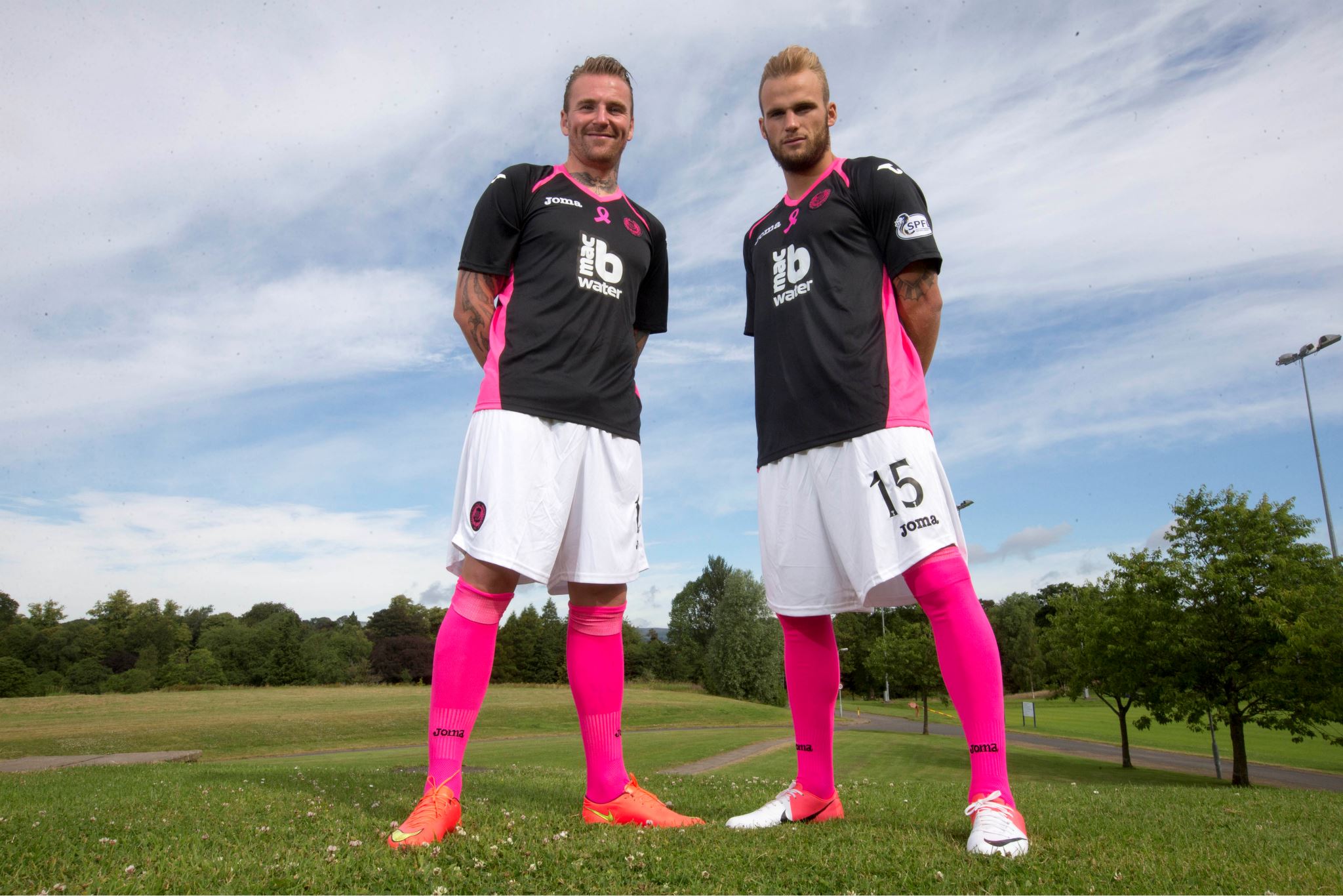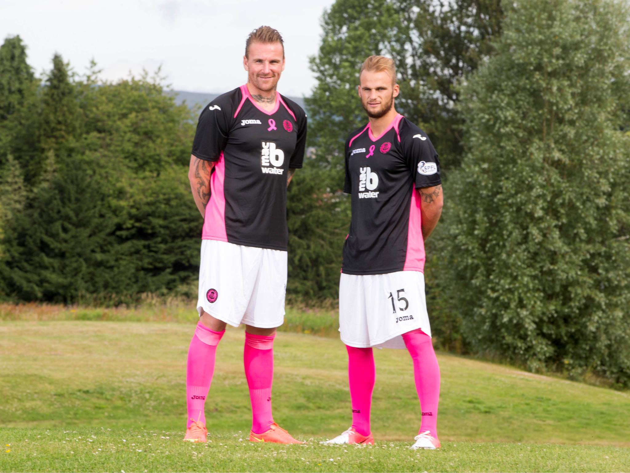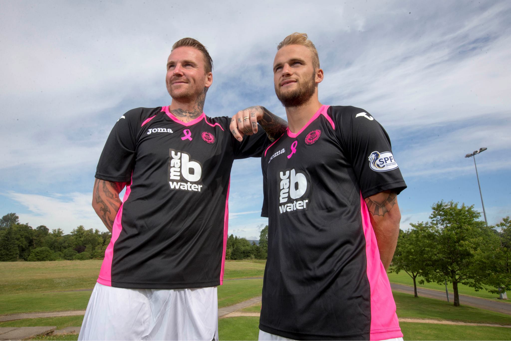 The shirt is designed to draw attention to the charity Breast Cancer Care Scotland - with each shirt sold seeing £3 donated to the cause - in black with pink panels on each side, the famous pink ribbon in the middle of the chest and further pink trim on the shoulders and by way of the neat V-neck collar. The sponsor, macb Water, has its logo in white.