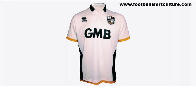 The white shirt with black trim, amber hem and cuffs and a neat black collar, carries the club sponsor GMB in black also. The Erreà logo and crest are fully embroidered.