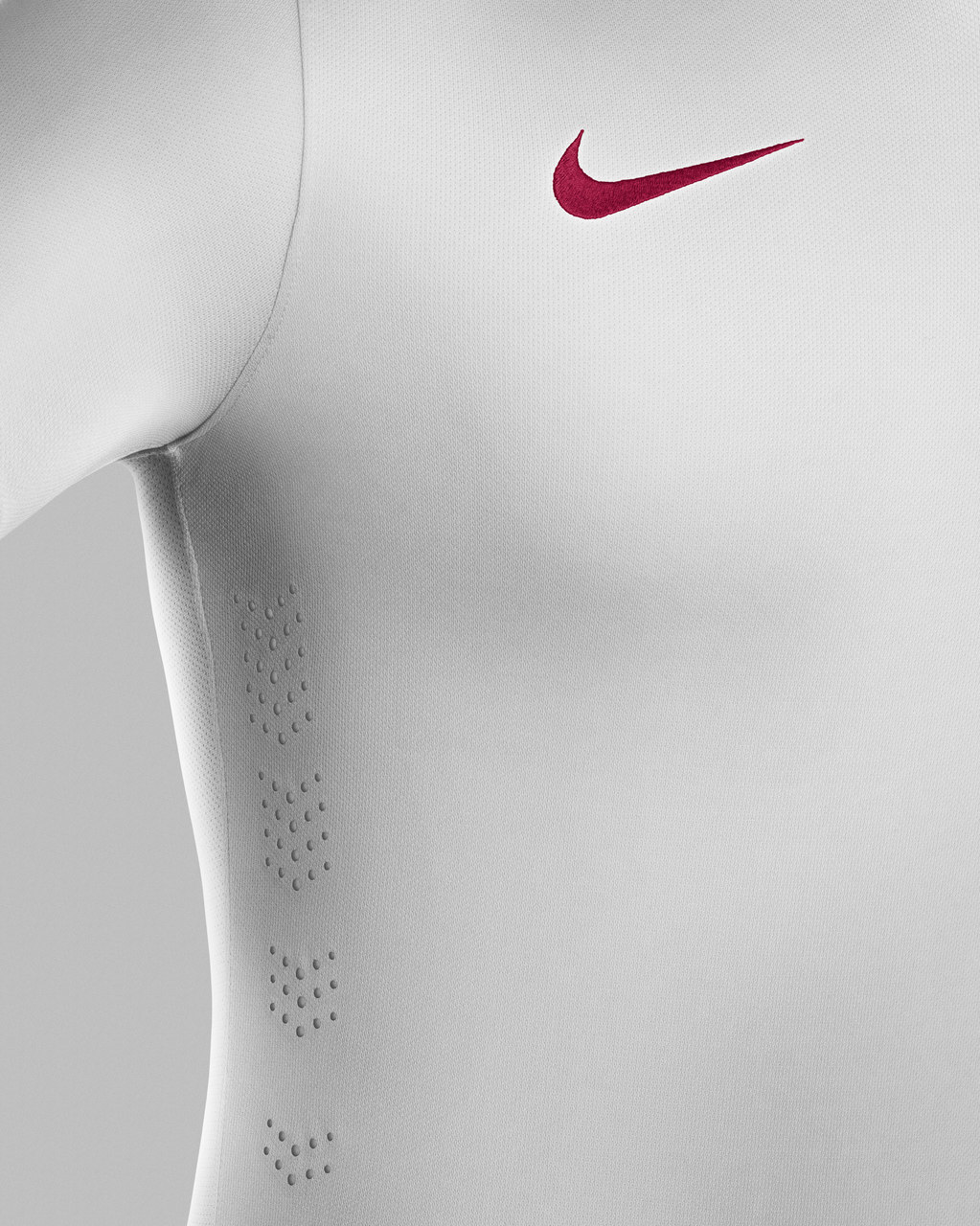 The away kit is predominantly white with contrasting maroon details. The federation crest is proudly positioned on the right side of the jersey, balanced with a Swoosh on the left side. Colored stripes on the shorts and socks correspond with the jersey’s cuffs to create a complete look.