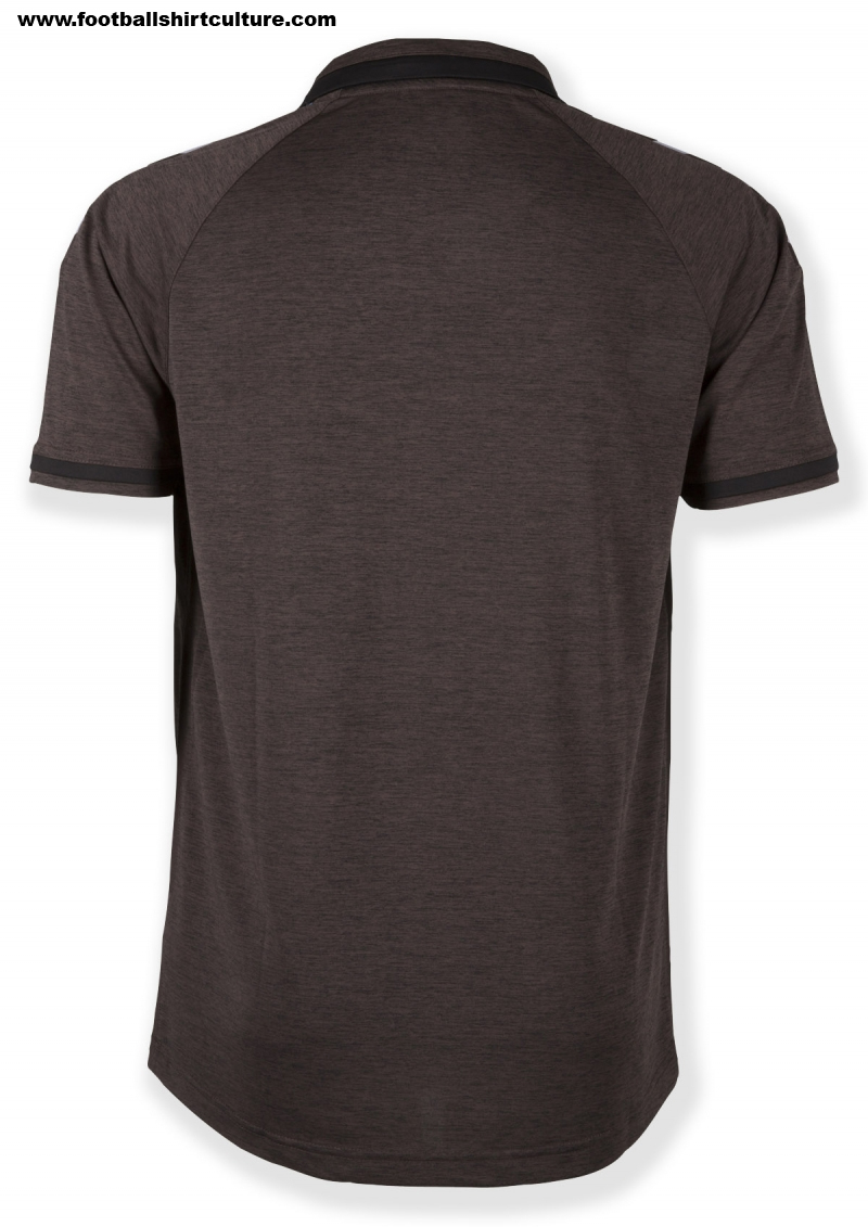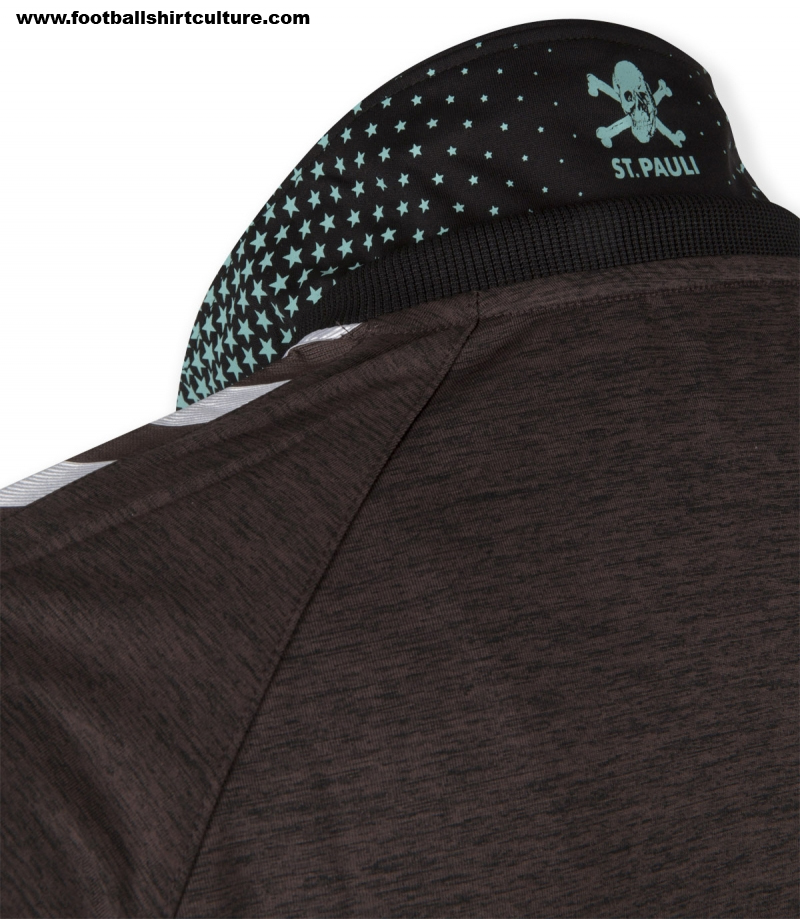 In the classic brown, the new shirt is kept relatively understated, but under the new foldover collar is a luminous star pattern with the famous St. Pauli skull and crossbones. The familiar hummel chevrons are in brown and grey, with black also being used in trim on the collar and cuffs.