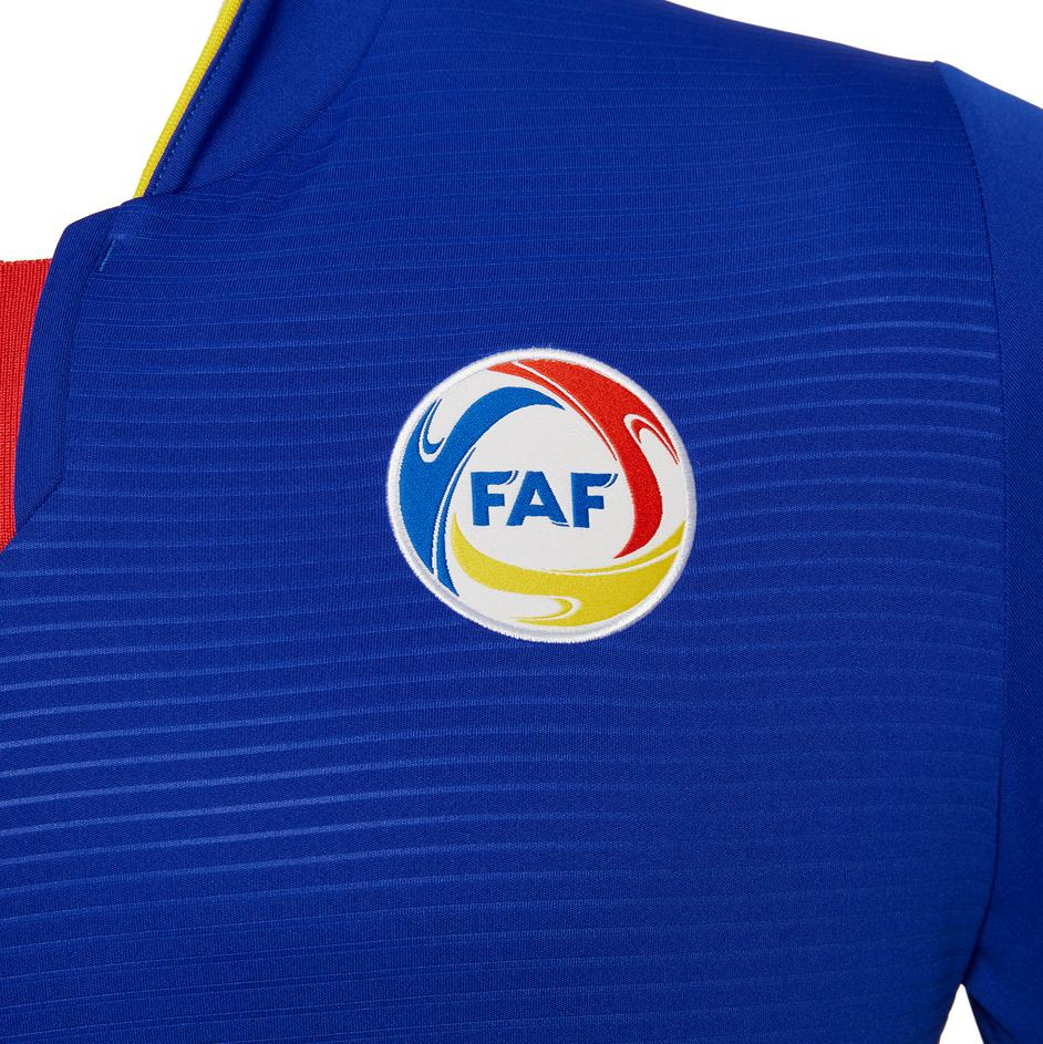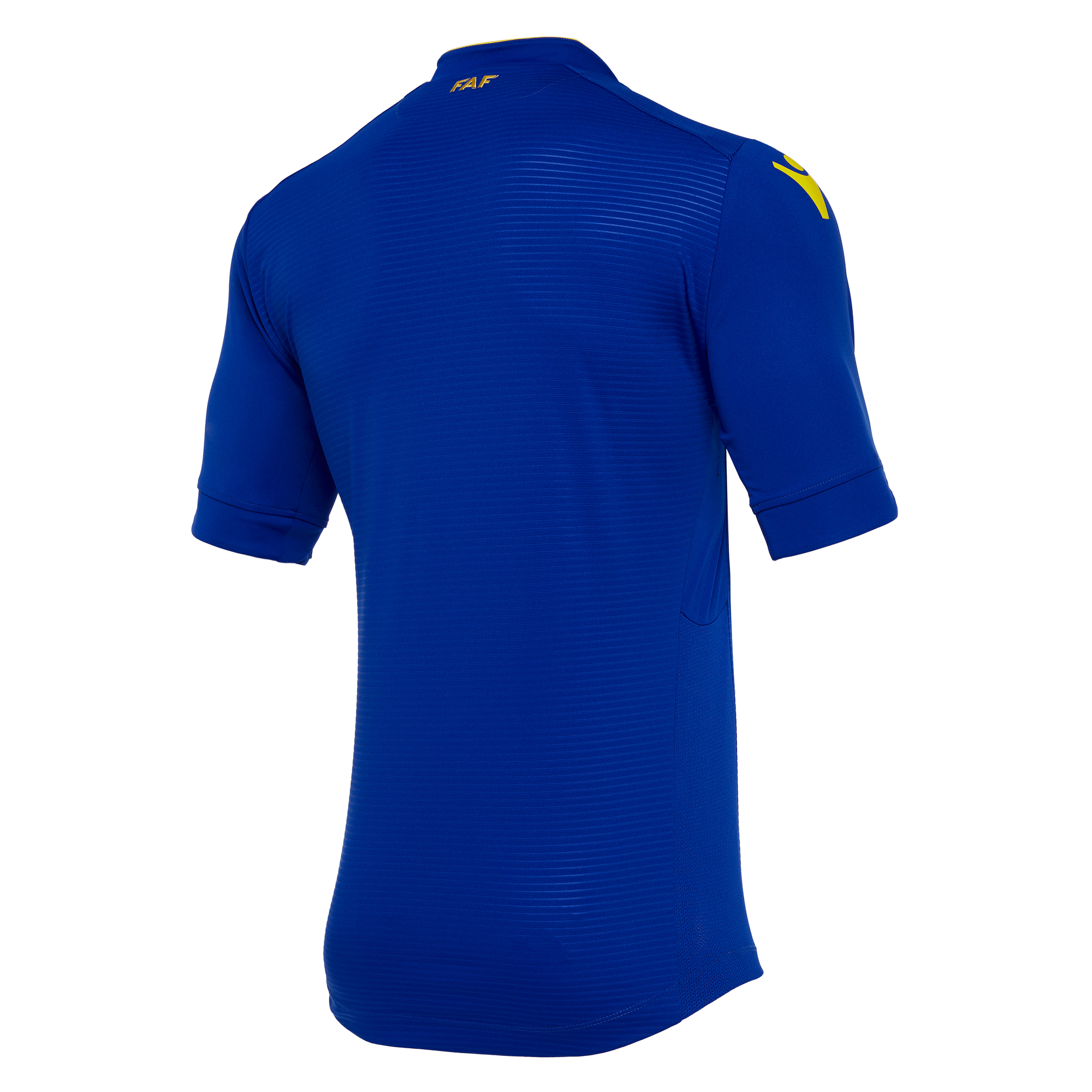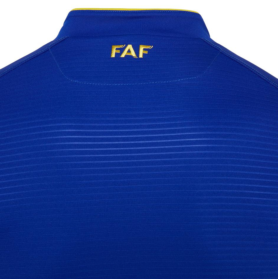 An elegant collar completes the shirt. An additional original feature is the horizontal striped embossed print on the front and back of the shirt. The badge of the federation is displayed on the left-hand side of the chest, while the 'FAF' logo (Federació Andorrana de Futbol) is embroidered on the back of the collar. The shirt features rib knit inserts on the collar and at the end of the sleeves, as well as mesh inserts in the sides.