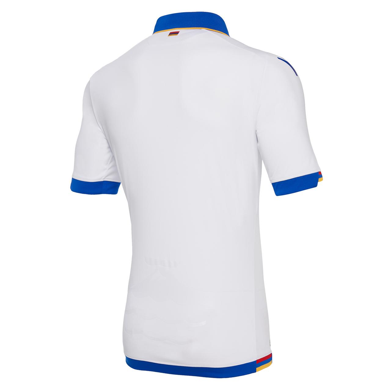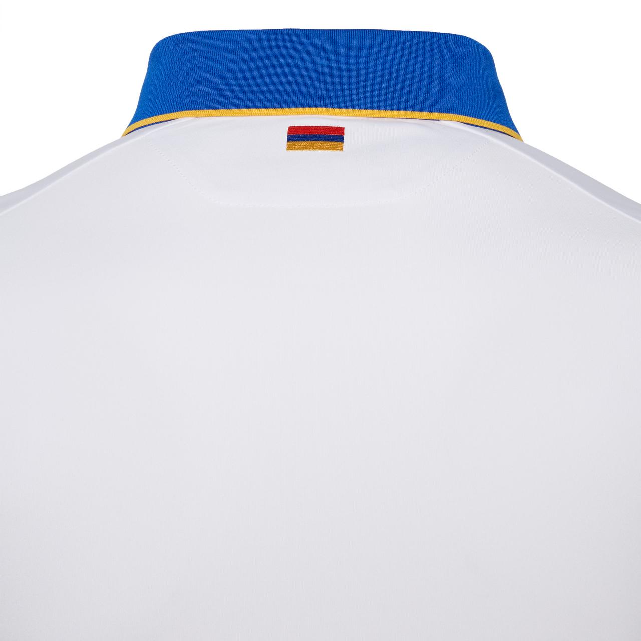 The Armenian away match shirt is predominantly white and is finished off by an elegant blue collar which creates a powerful colour contrast. The front of the shirt features an embossed print depicting the logo of the federation.