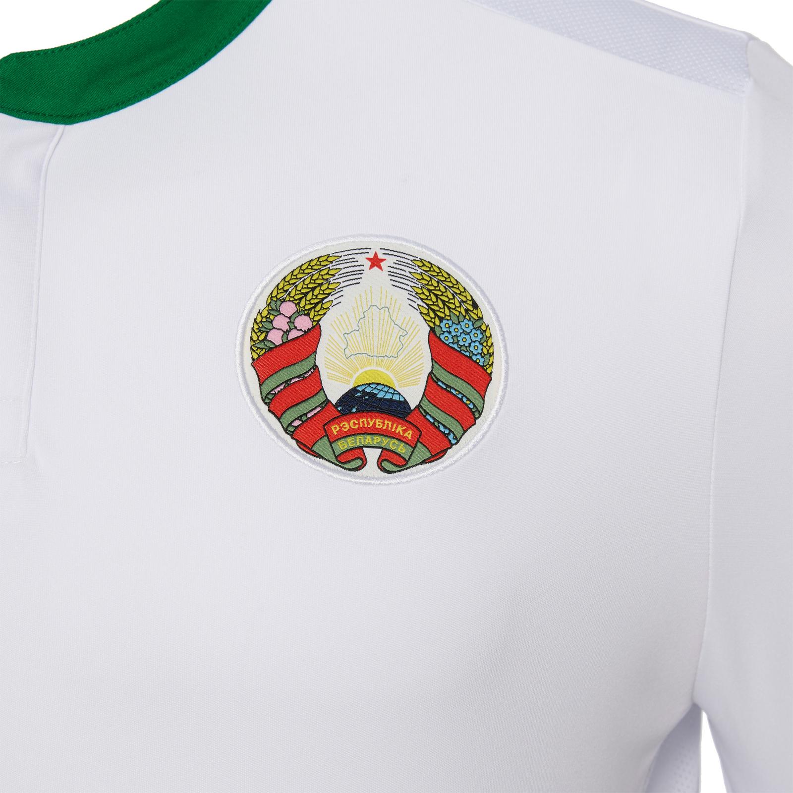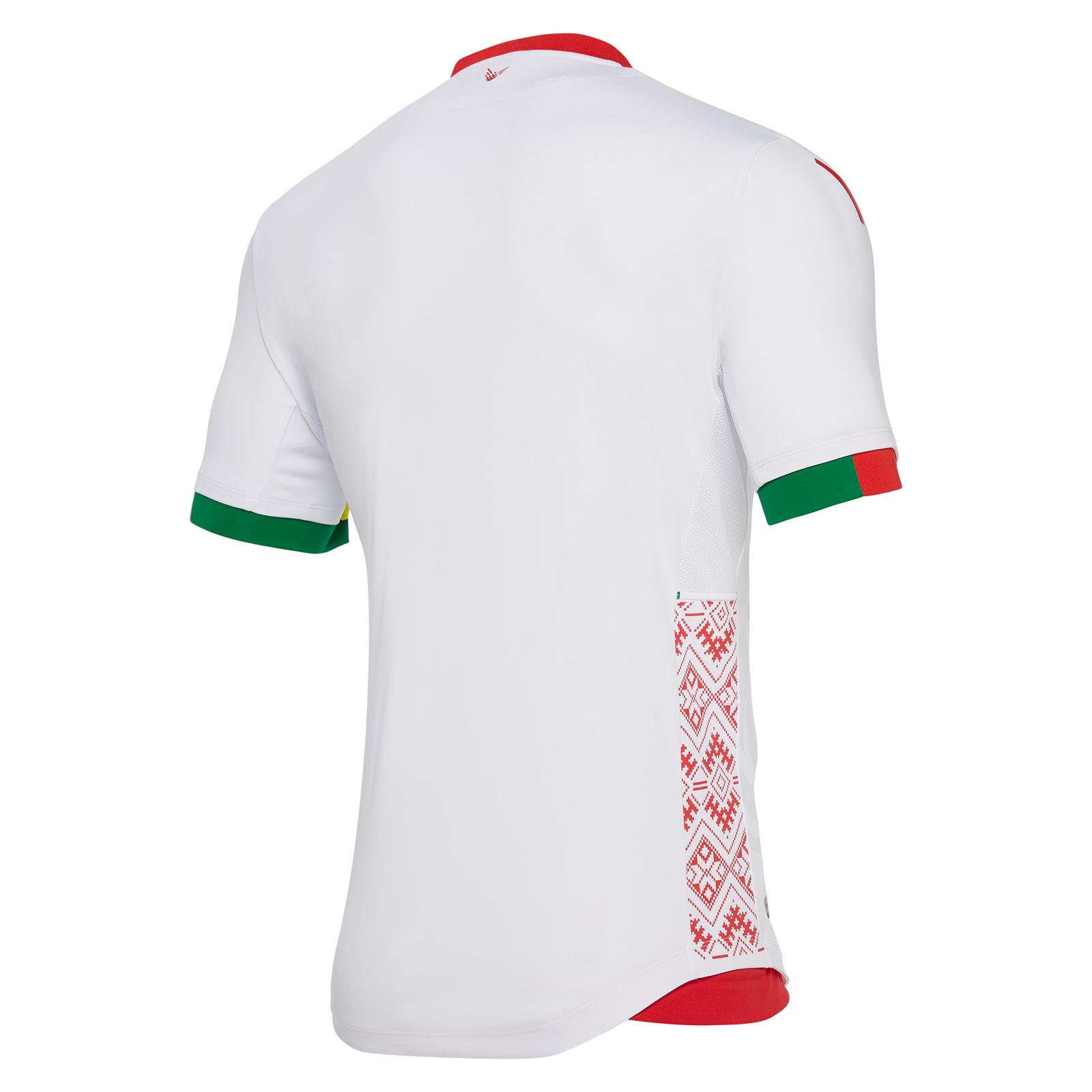 The Belorussian home match is in-keeping with the traditional colours of the national flag and are predominantly white with green-and-red details. The shirt is characterised by a bold design on the side bands proudly displaying the national flag and its traditional decoration.