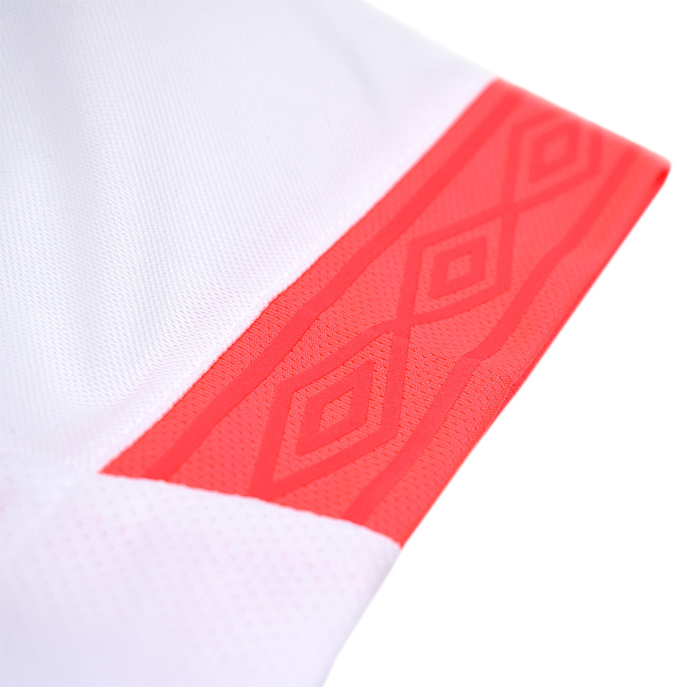 The shirt features front raglan sleeve styling for close playing fit and fiery coral running diamond at the sleeve for an optical flash of colour.