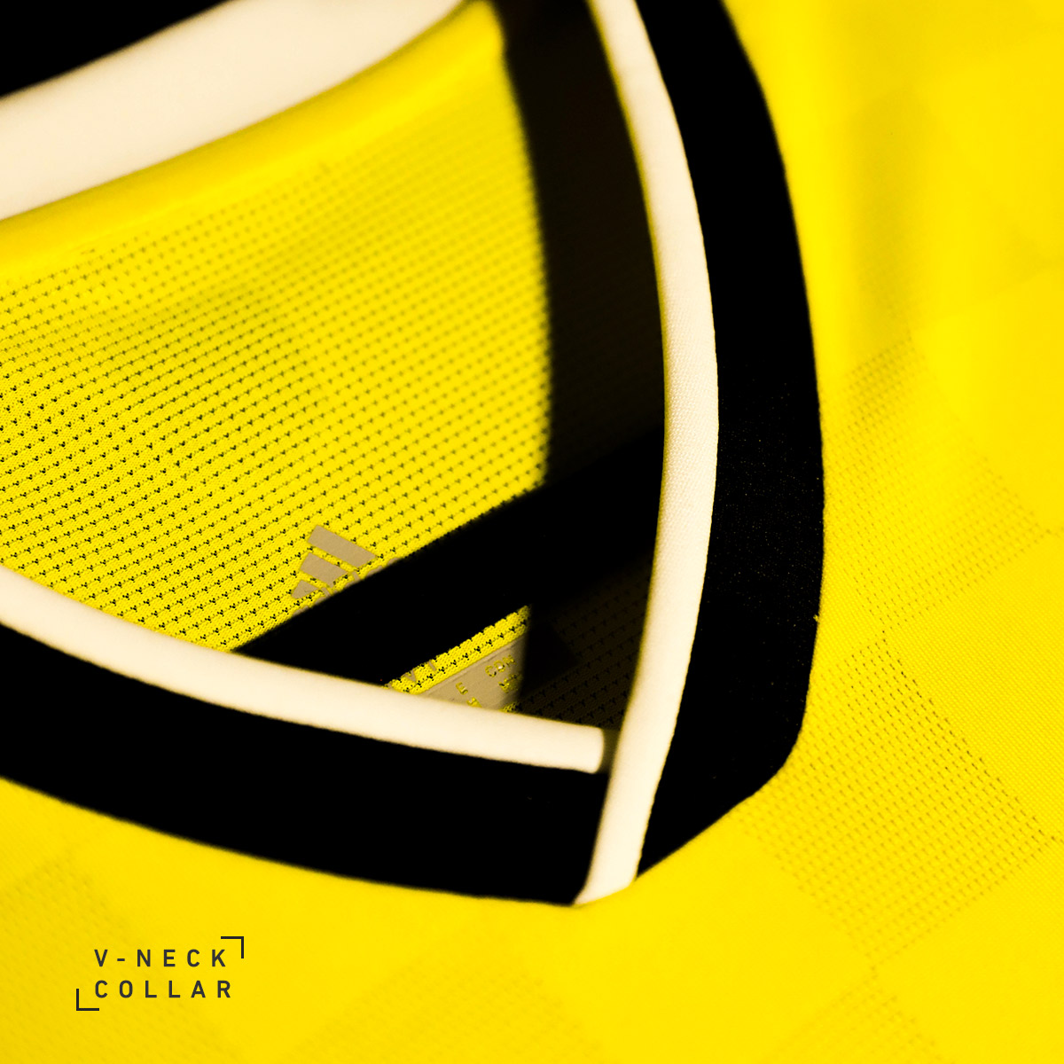 The 2019 Gold Kit features a black V-neck collar with a white stripe, sleeves with black trim that features a white stripe, and embossed checkerboard fabric.