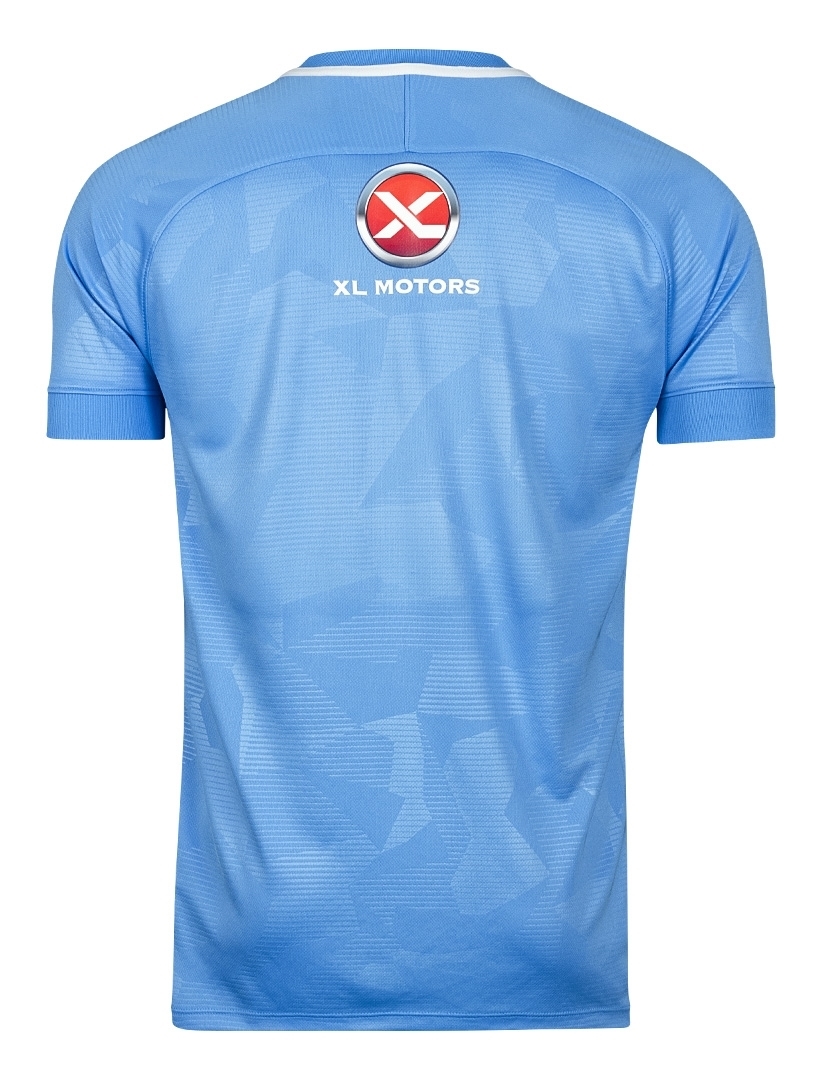 The Home Shirt is complimented with Sky Blue Shorts and Socks.
