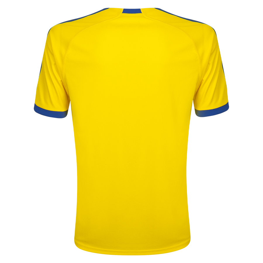 The shirt, shorts and socks are dominated by a vibrant “cyber” yellow, and the shirt has an iconic red and blue vertical stripe with a fade effect – much like the home strip.
