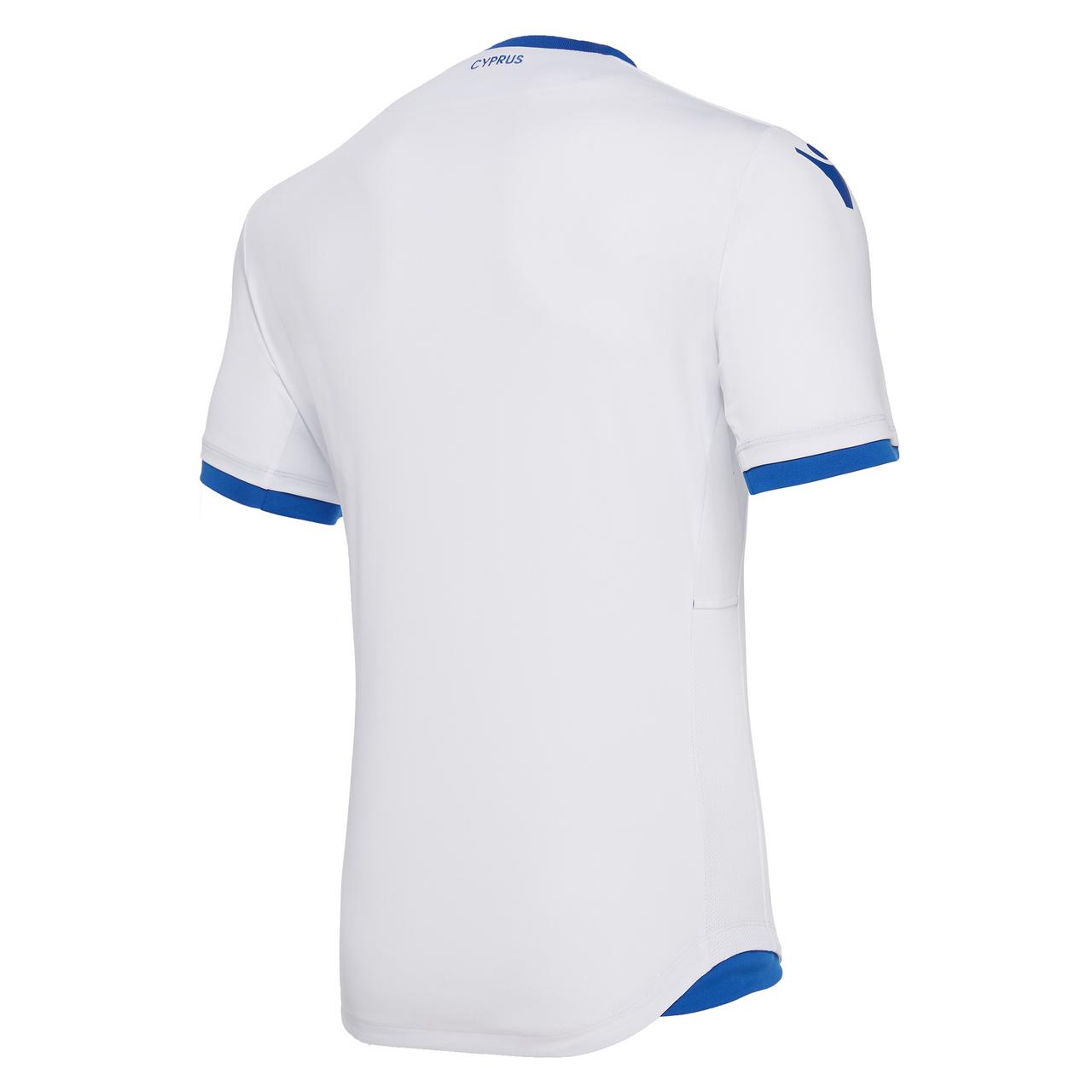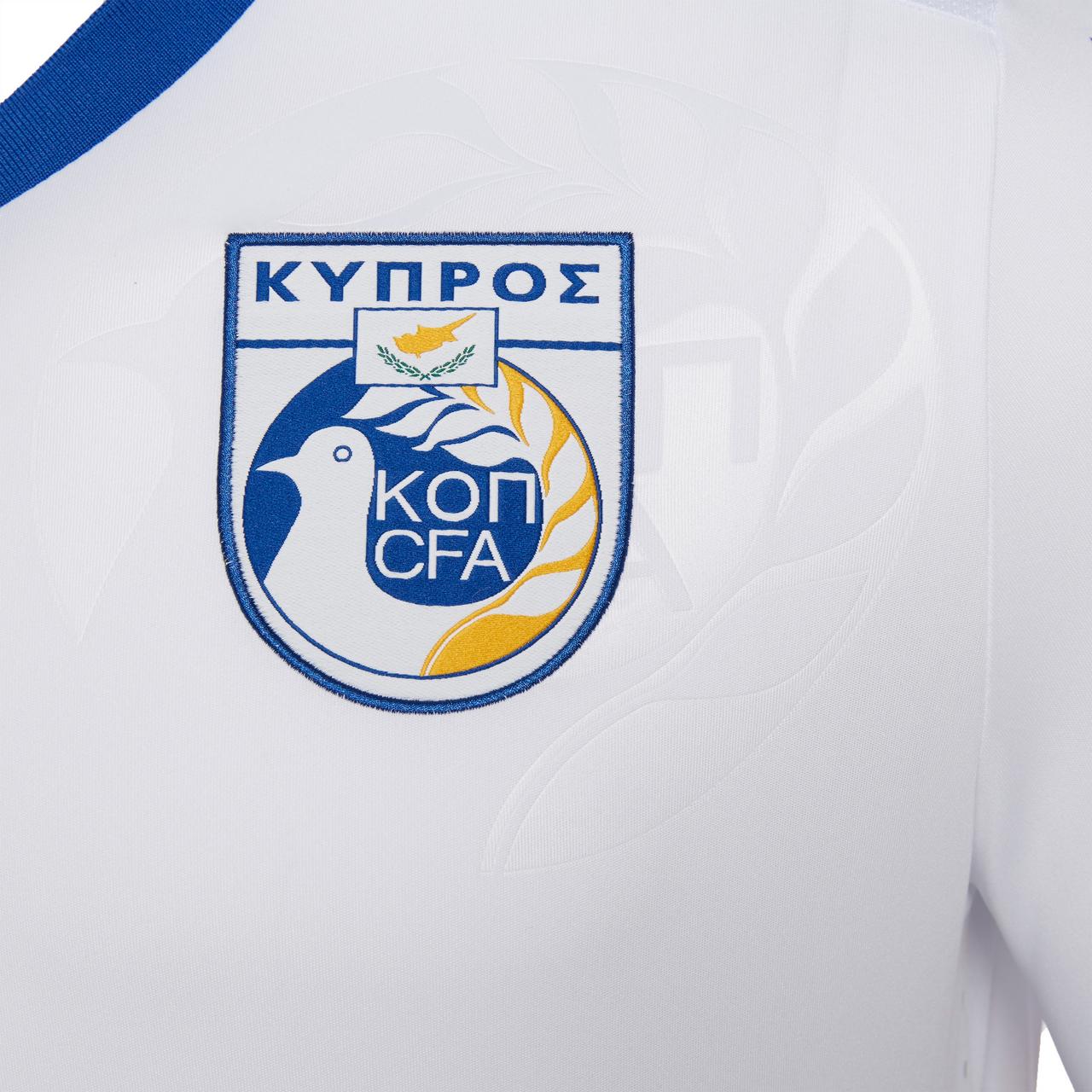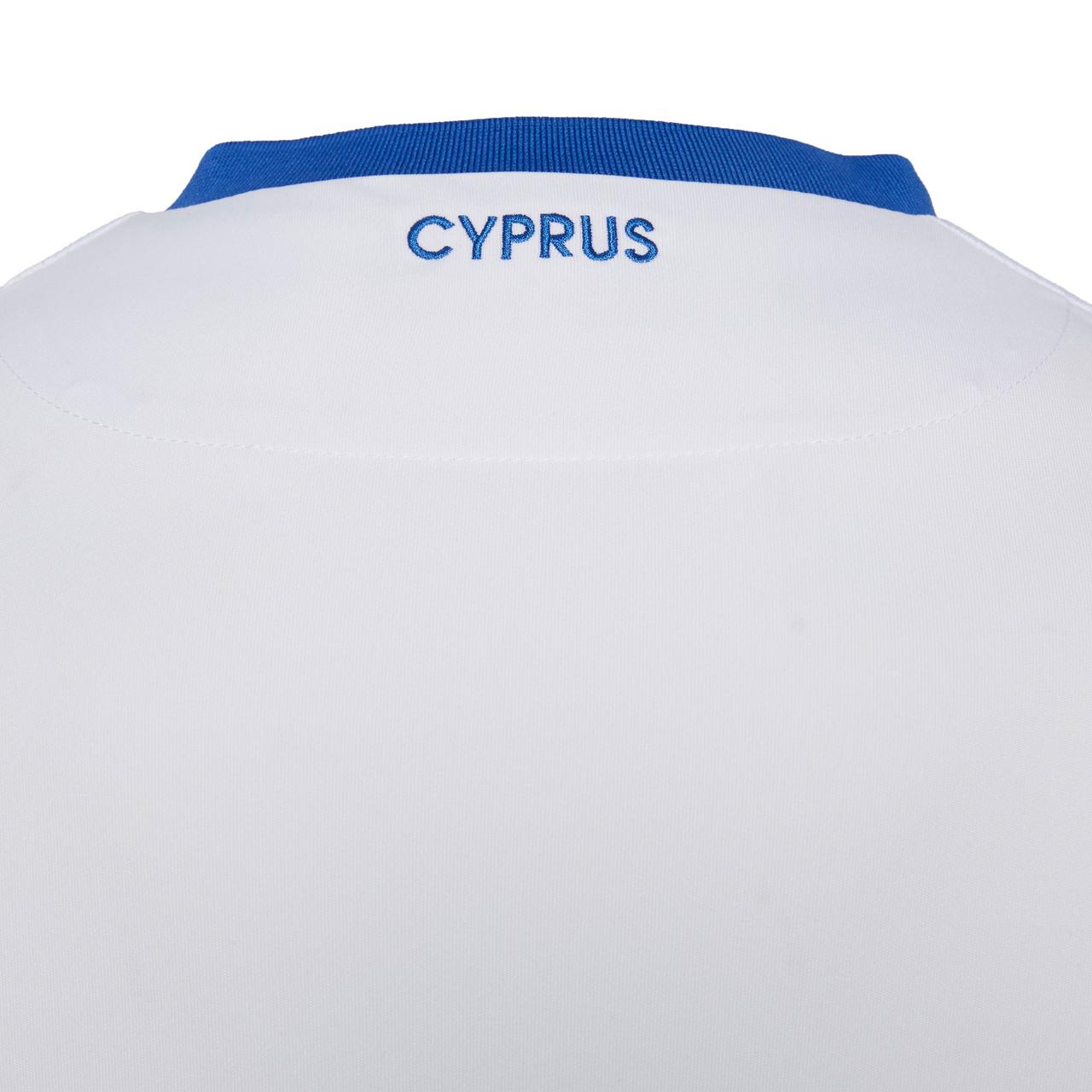 The away match shirt of the Cypriot federation is predominantly white with subtle blue details.
