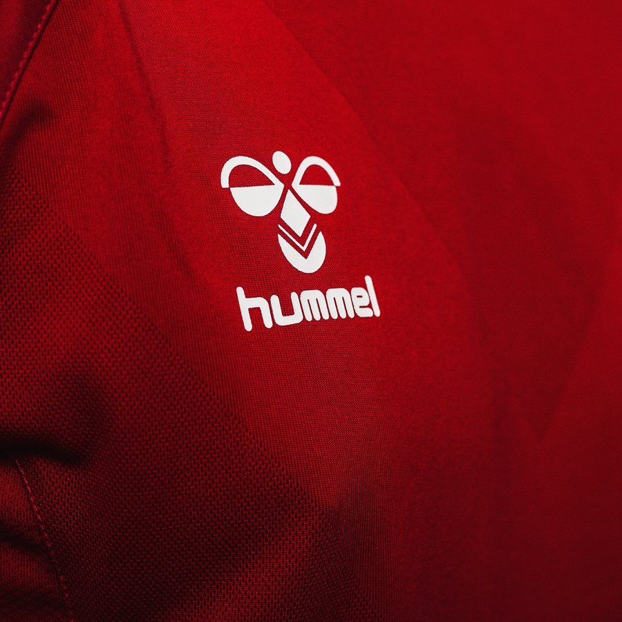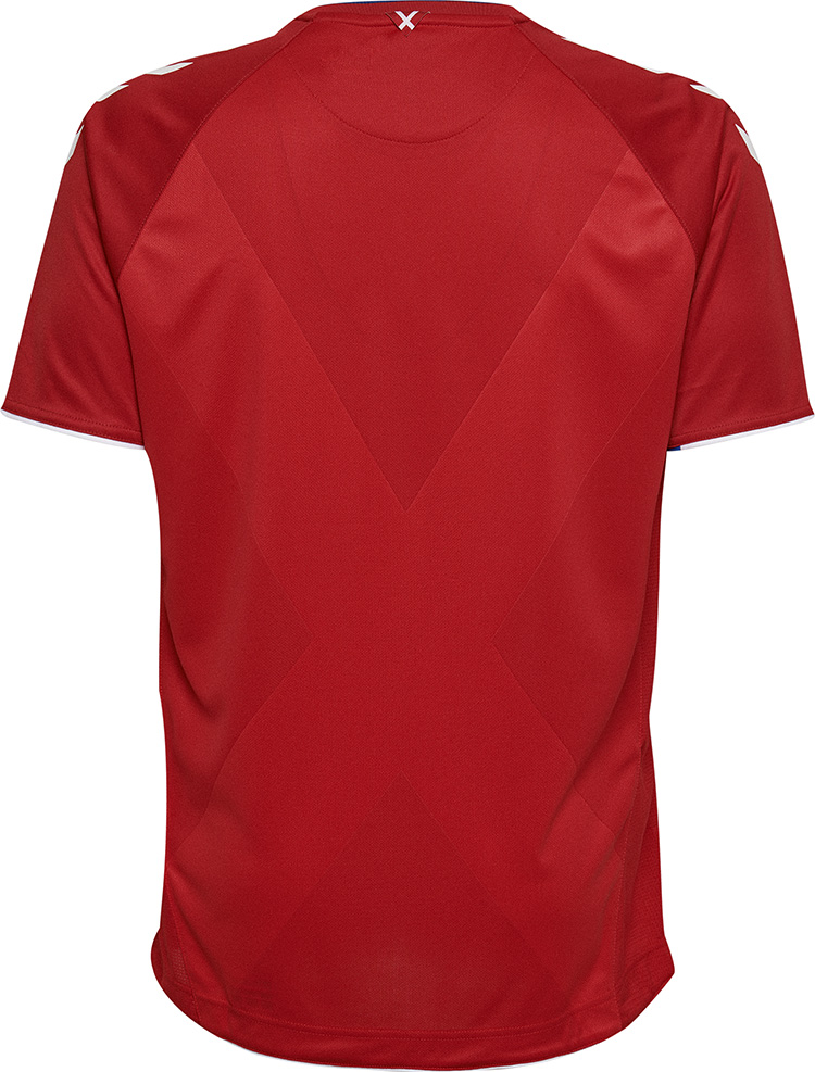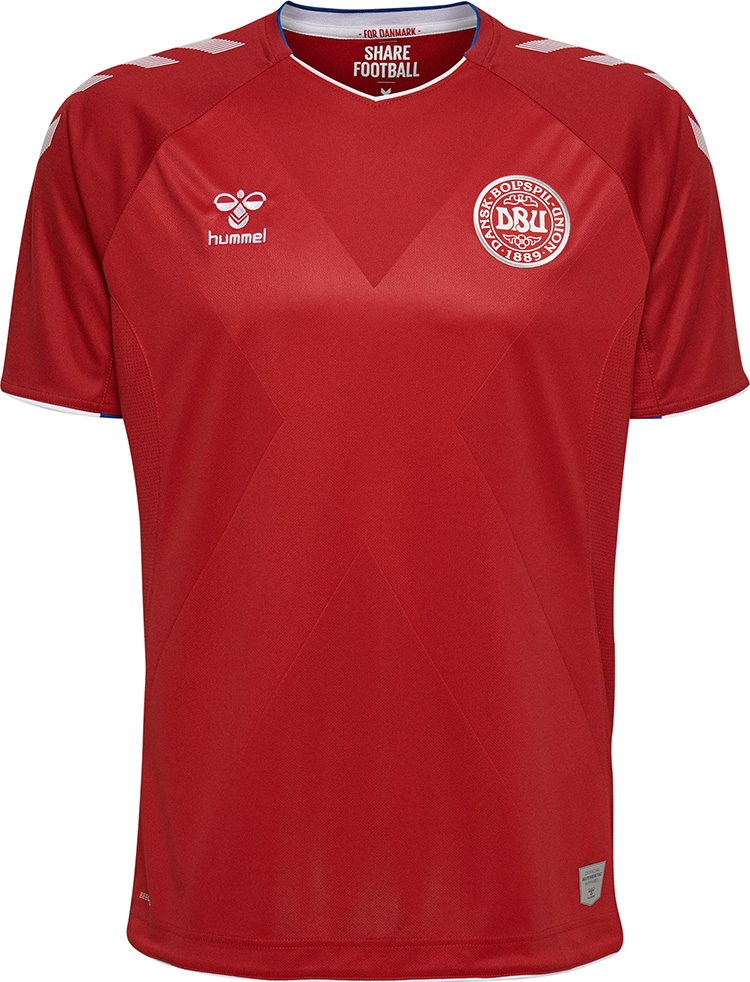 In contrast to the red national team jersey you will find a white redesigned chevron print on the sleeves, a white hummel logo print and a red/white DBA logo badge.