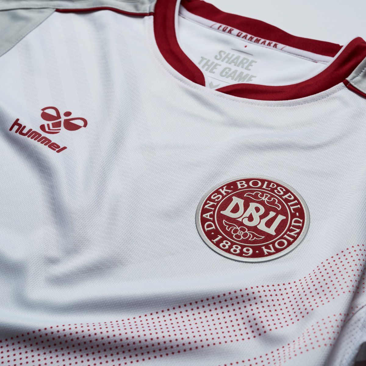 Hummel have been inspired by the uniform of the Danish Guardsmen and their uniform's classic red and white colour combination. The new white away jersey is designed with inspiration from the Danish Guardsmen. Classic hummel chevrons are placed at both front and on the shoulders.