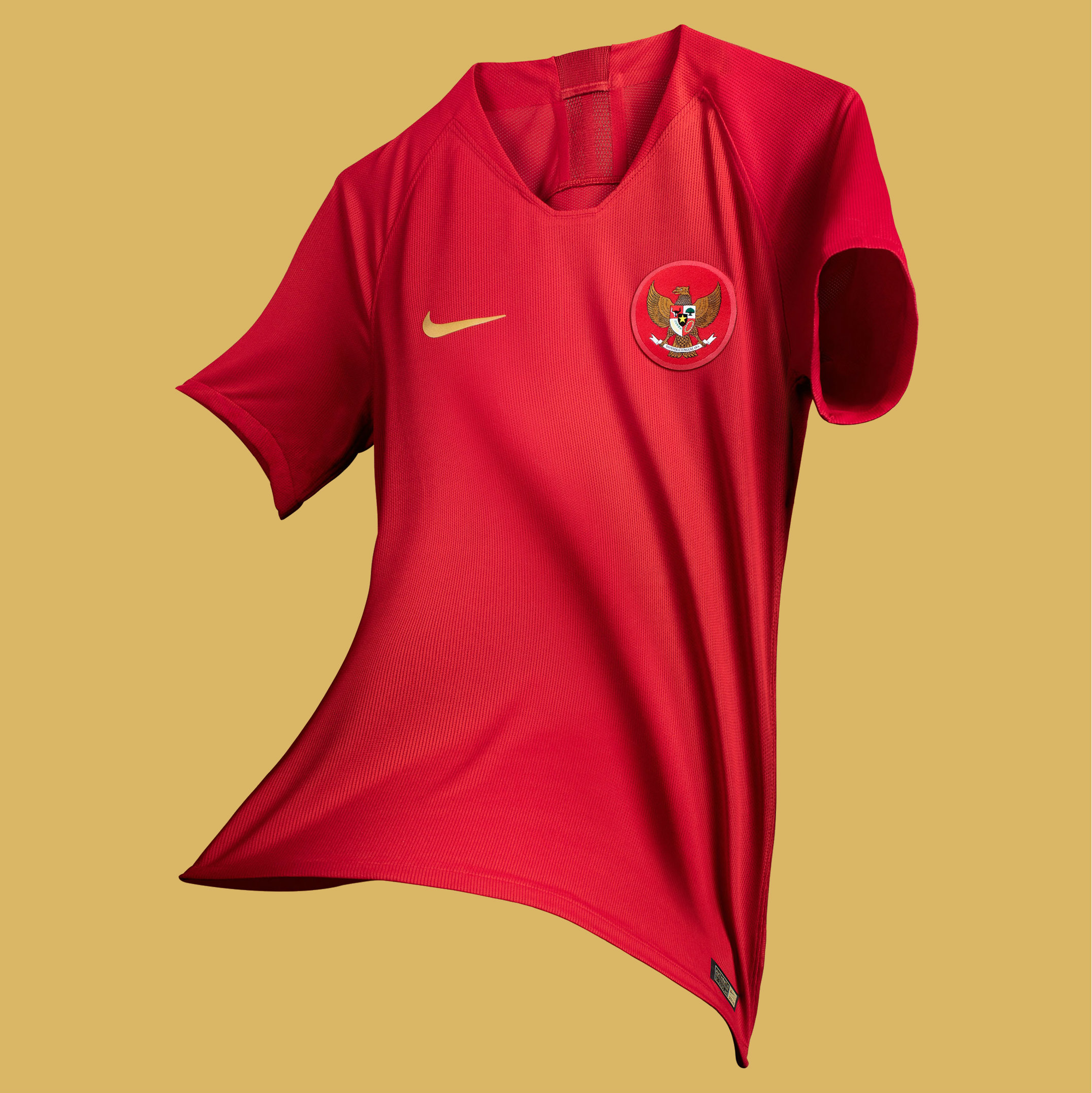 The colour scheme of this year’s home kit honours the national emblem of Indonesia, the Garuda (a mythical bird-like creature), through a traditional red with gold accents.