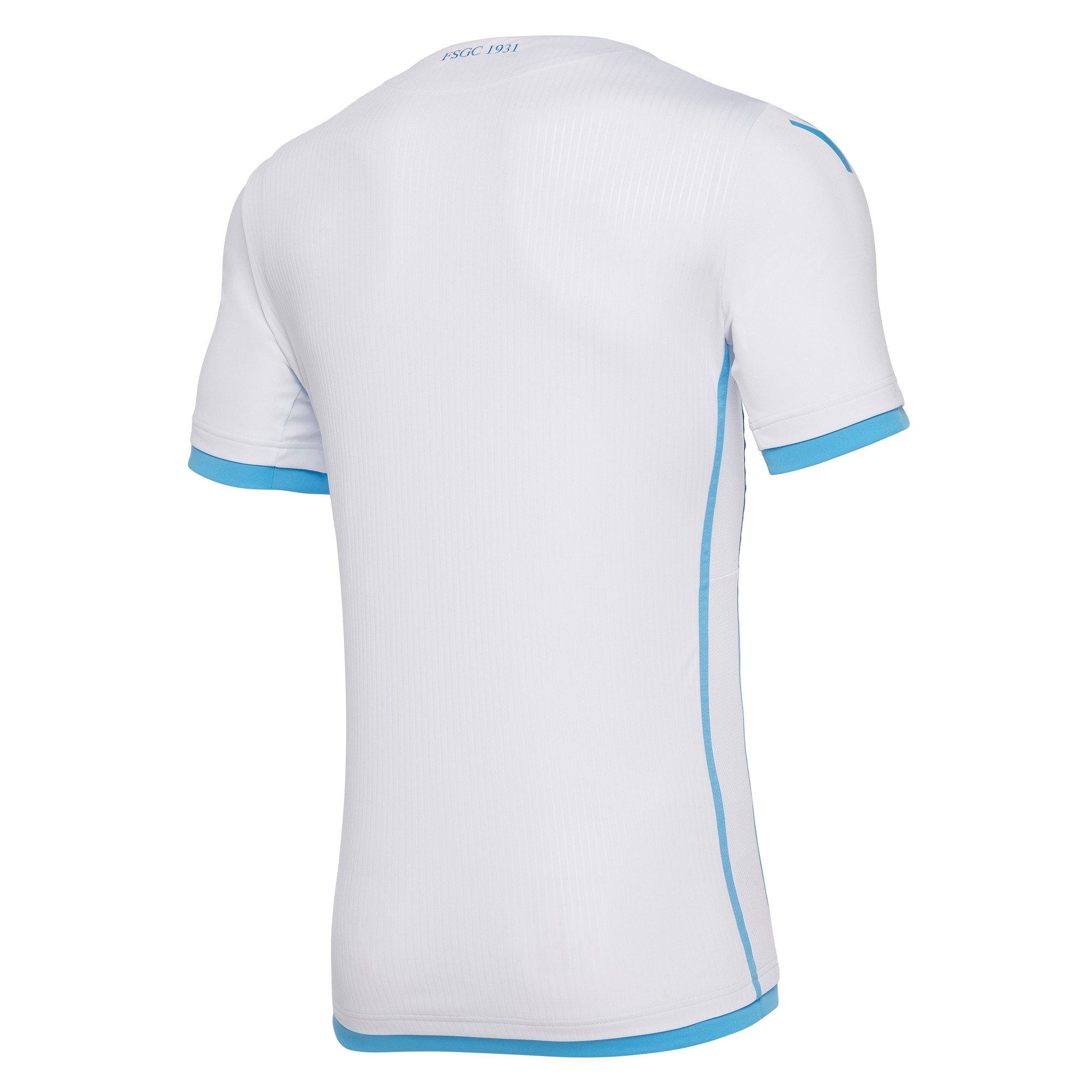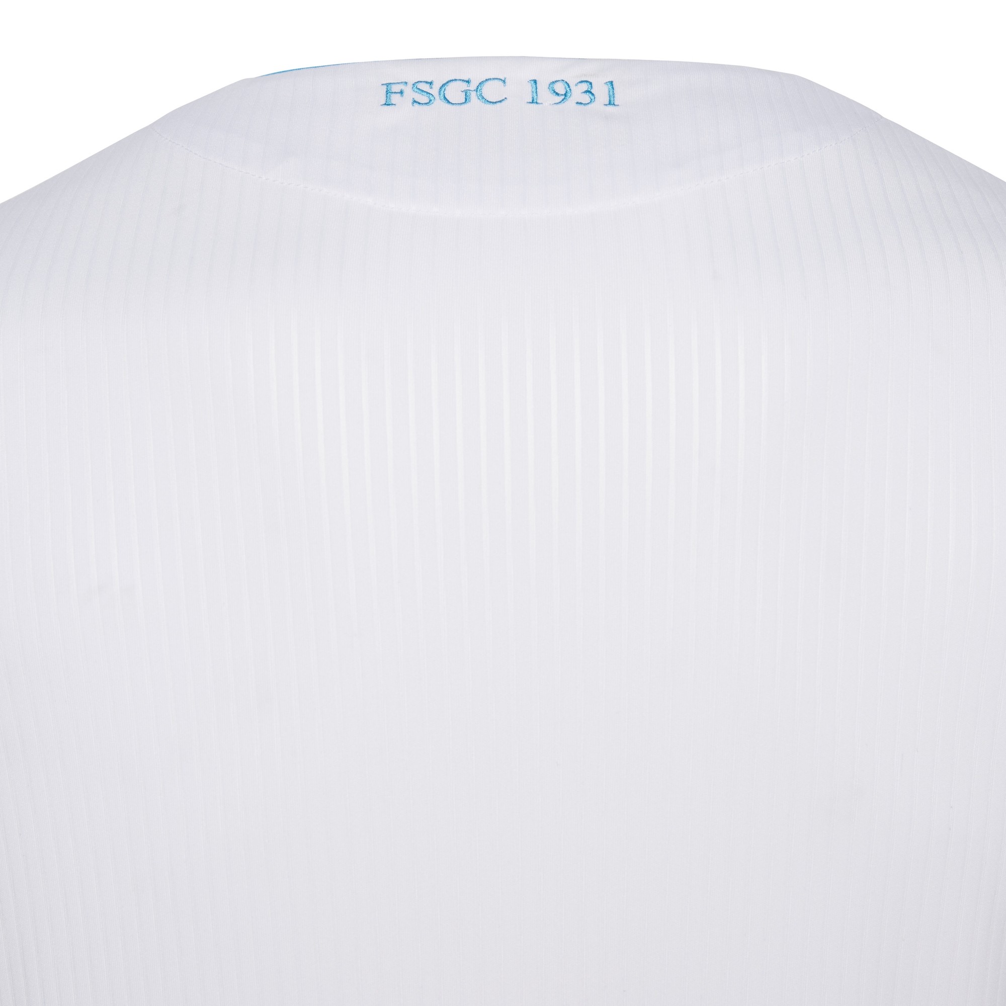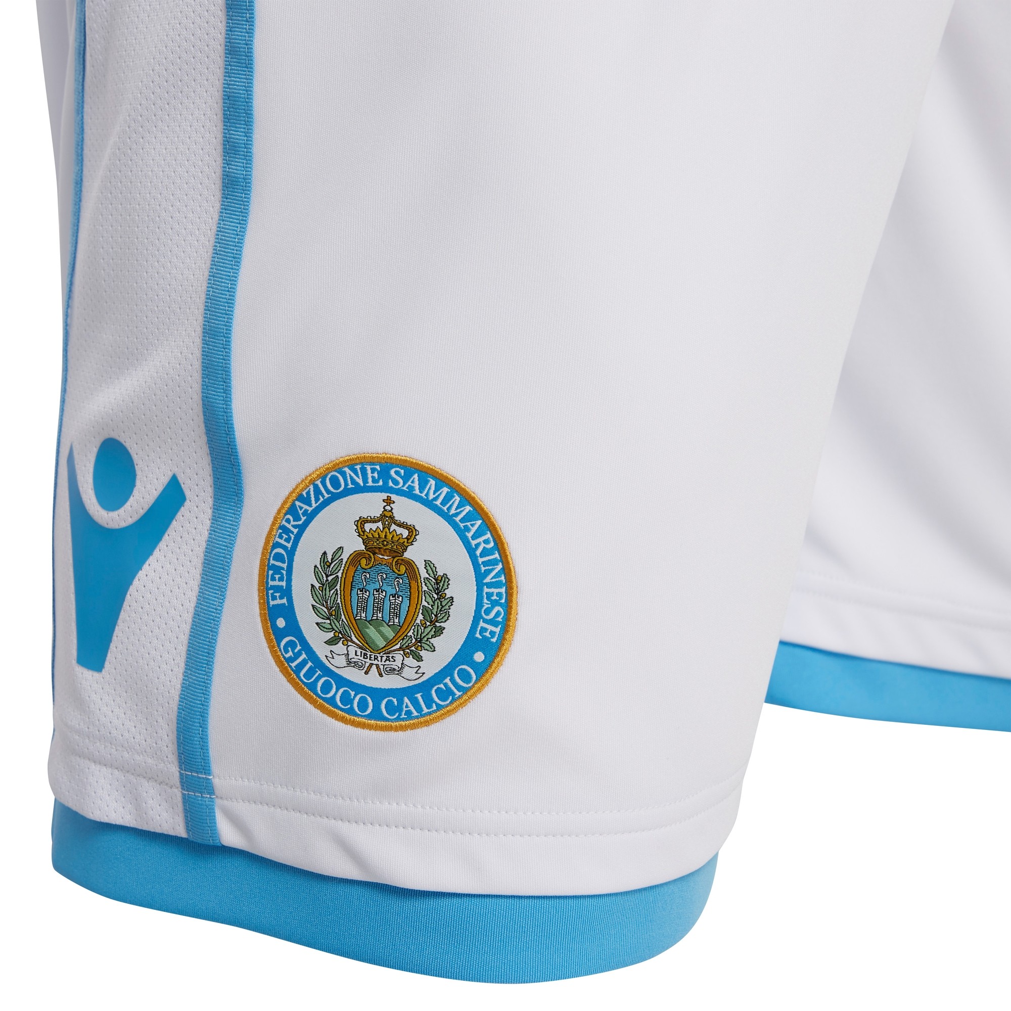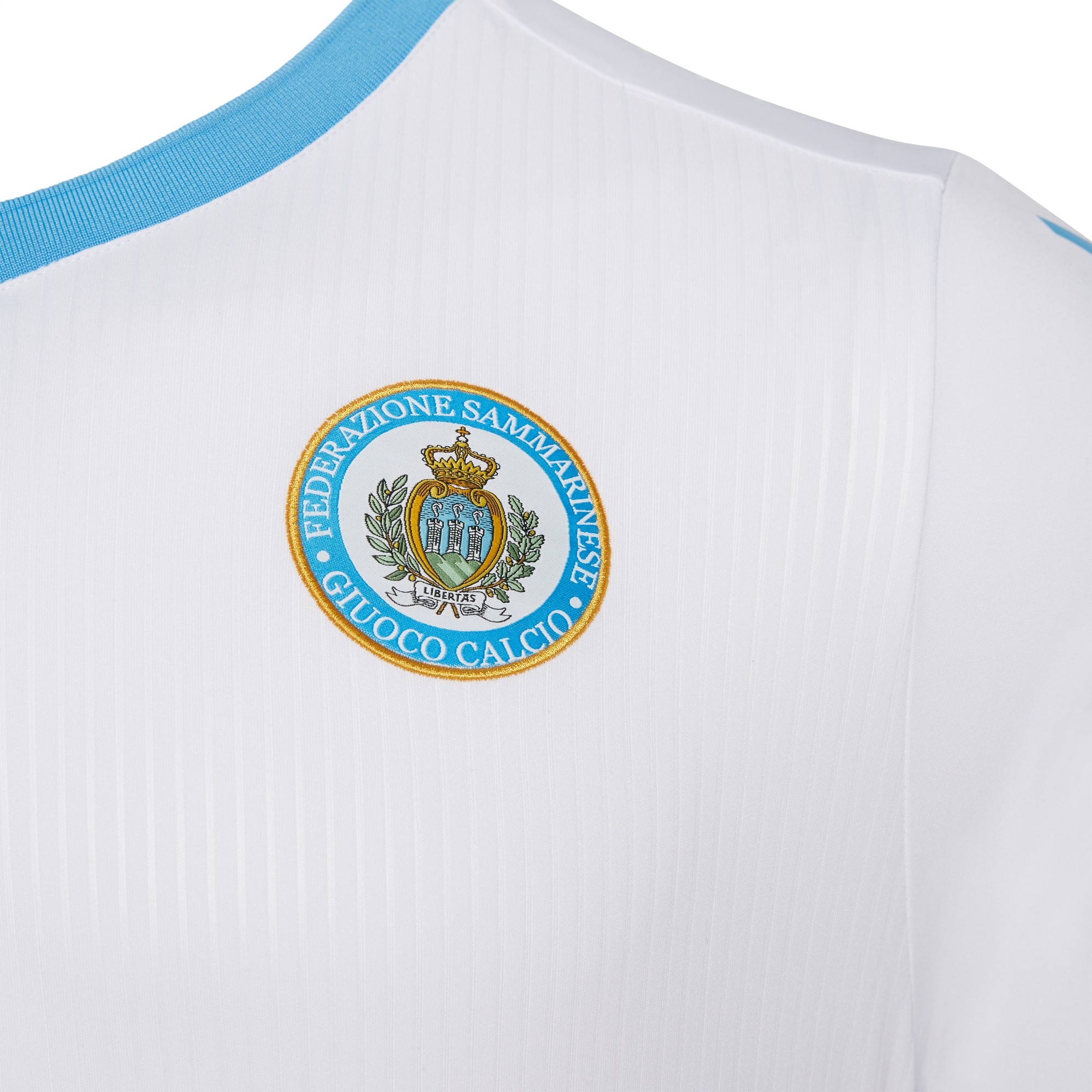 The away match shirt of the federation of San Marino is predominantly white with a few contrasting sky blue details. The shirt features a smart pin striped design and several details that refer to the history of the federation: on the back of the collar it has the 'FSGC 1931' logo while it has been personalised below the neck at the back with the phrase 'L'antica terra della libertà'.