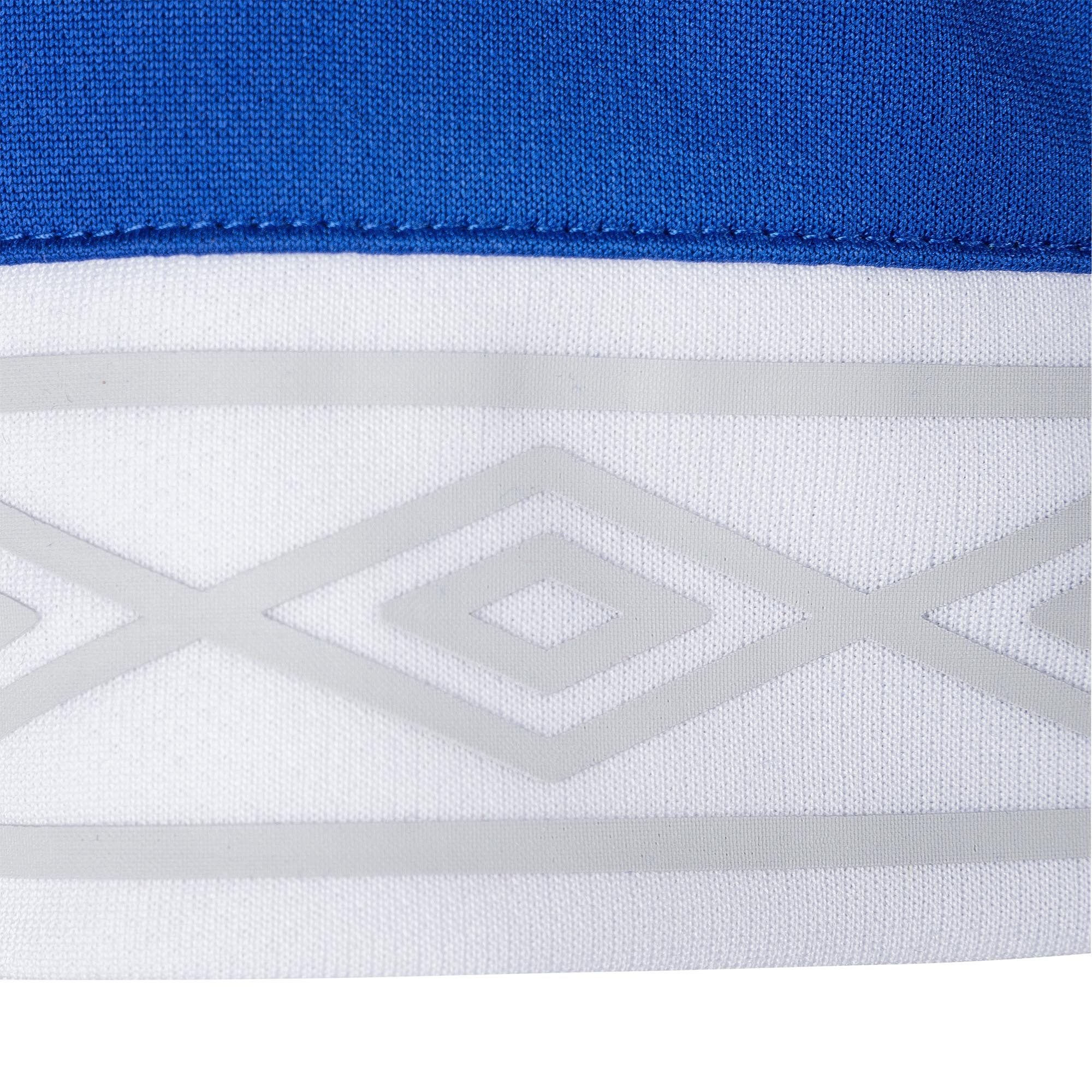 The center of the jersey has an interlaced hammer and pick; the pattern is shown over the whole shirt. The jersey is emphasized by white sleeve cuffs and a white neckline. The white shorts and blue/white striped socks round off the image.