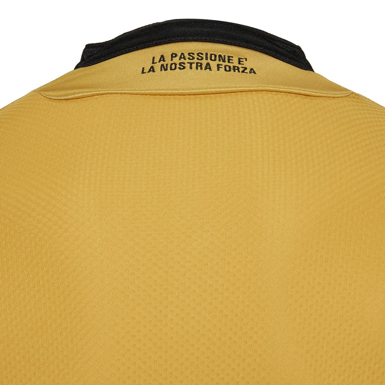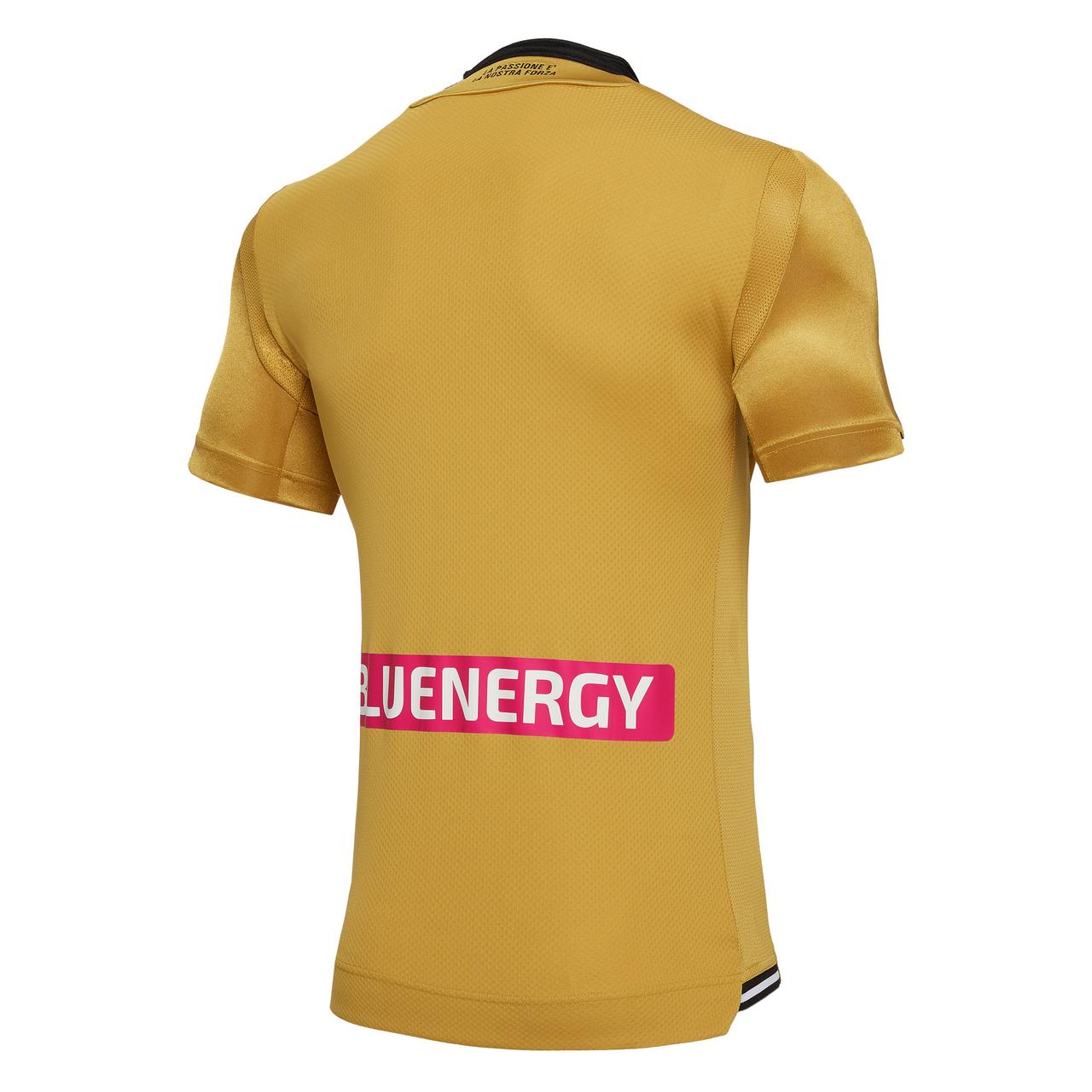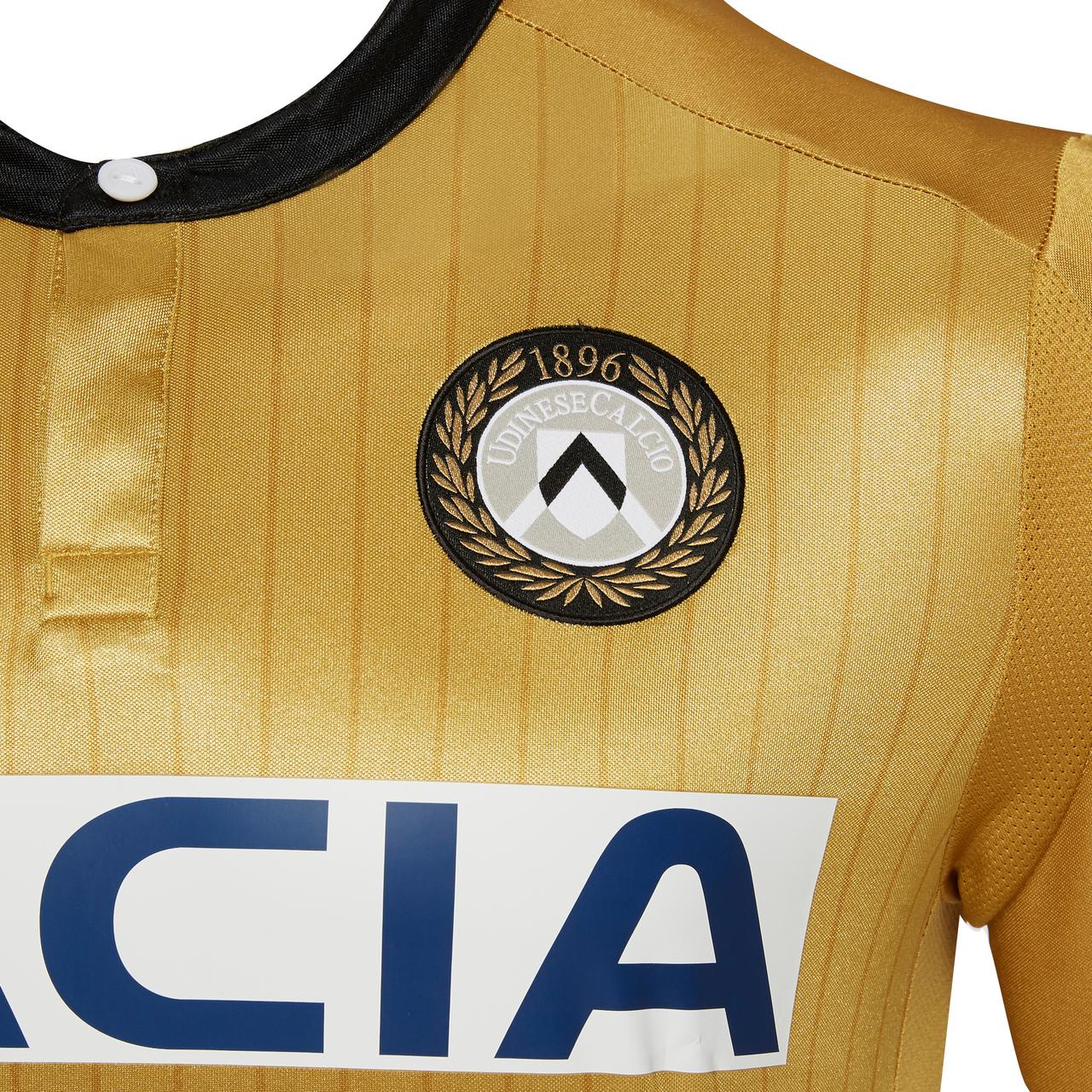 Udinese Calcio and Macron have revealed the new Away kit for the upcoming season: the jersey is all gold with a black border around the Korean-style collar with three press-studs, black and white details around the sleeves and the bottom of the jersey. On the front, an elegant tone on tone pinstripe.