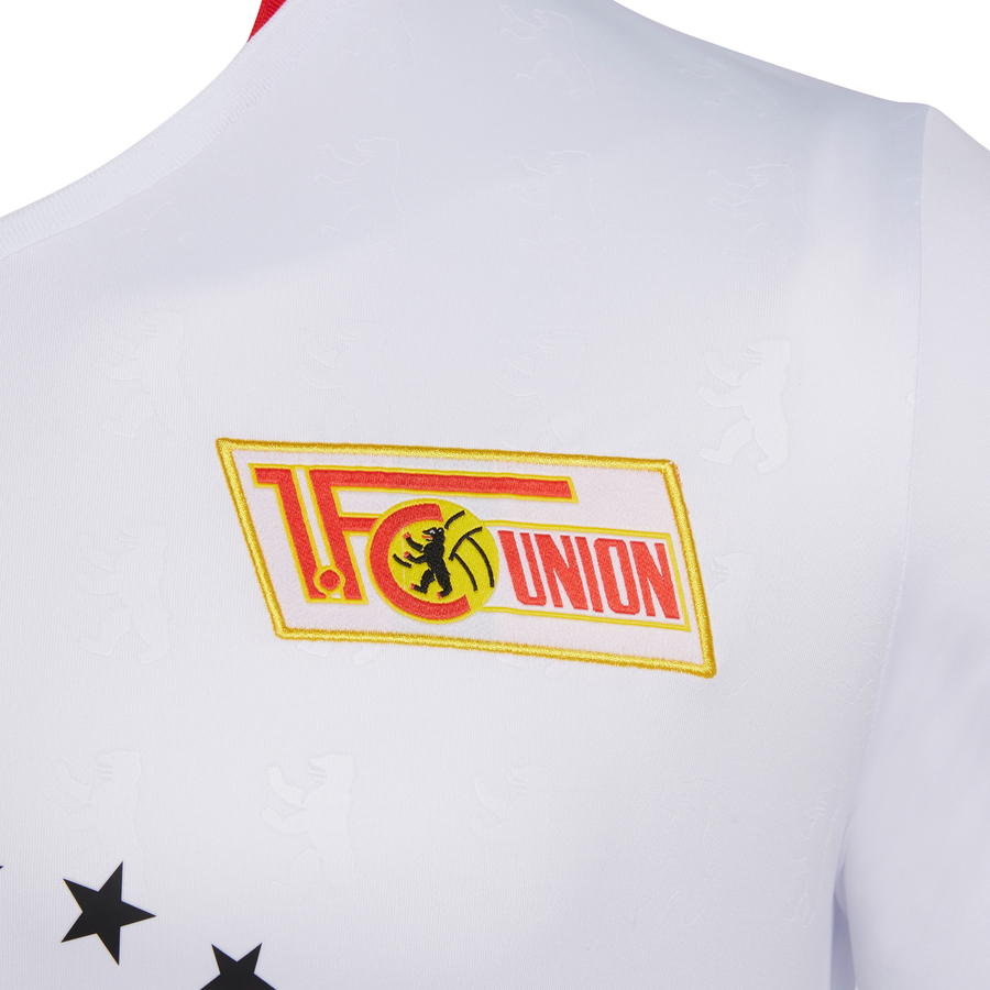 The Away shirt is white with a repeated graphic of bears across the front and red detailing. This shirt is unique thanks to its two-tone printed design on the front and the reproduction of the bear, unmistakable symbol of the city of Berlin.