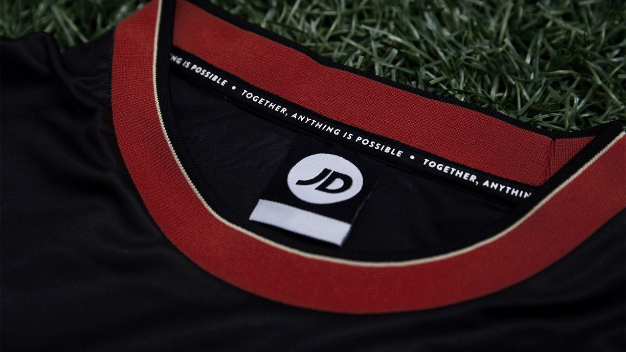 The traditional red and black stripes are accompanied on the shirt by a solid black chest design, along with gold trim to the sleeves and round neck colour. The kit is the first to feature the iconic JD roundel.